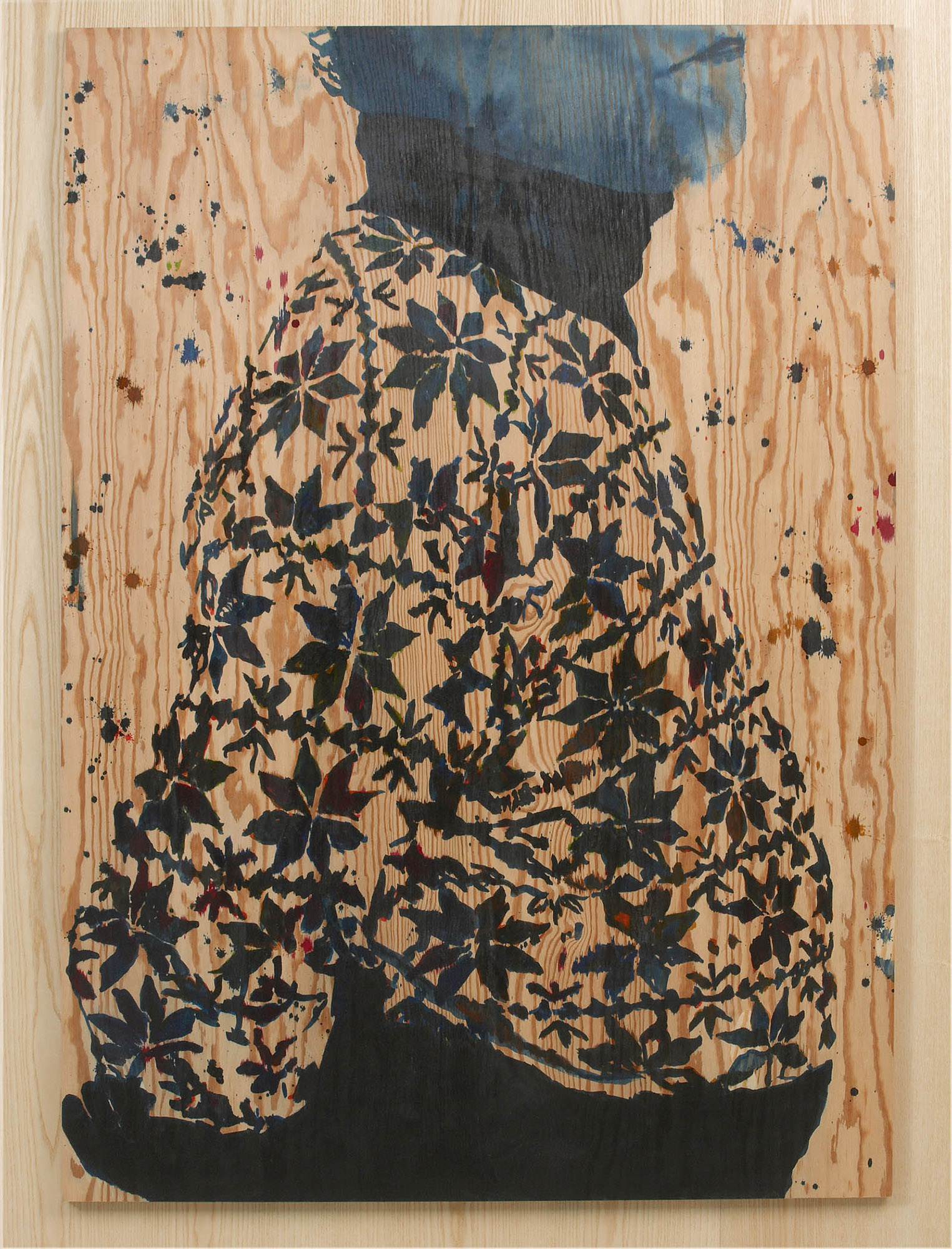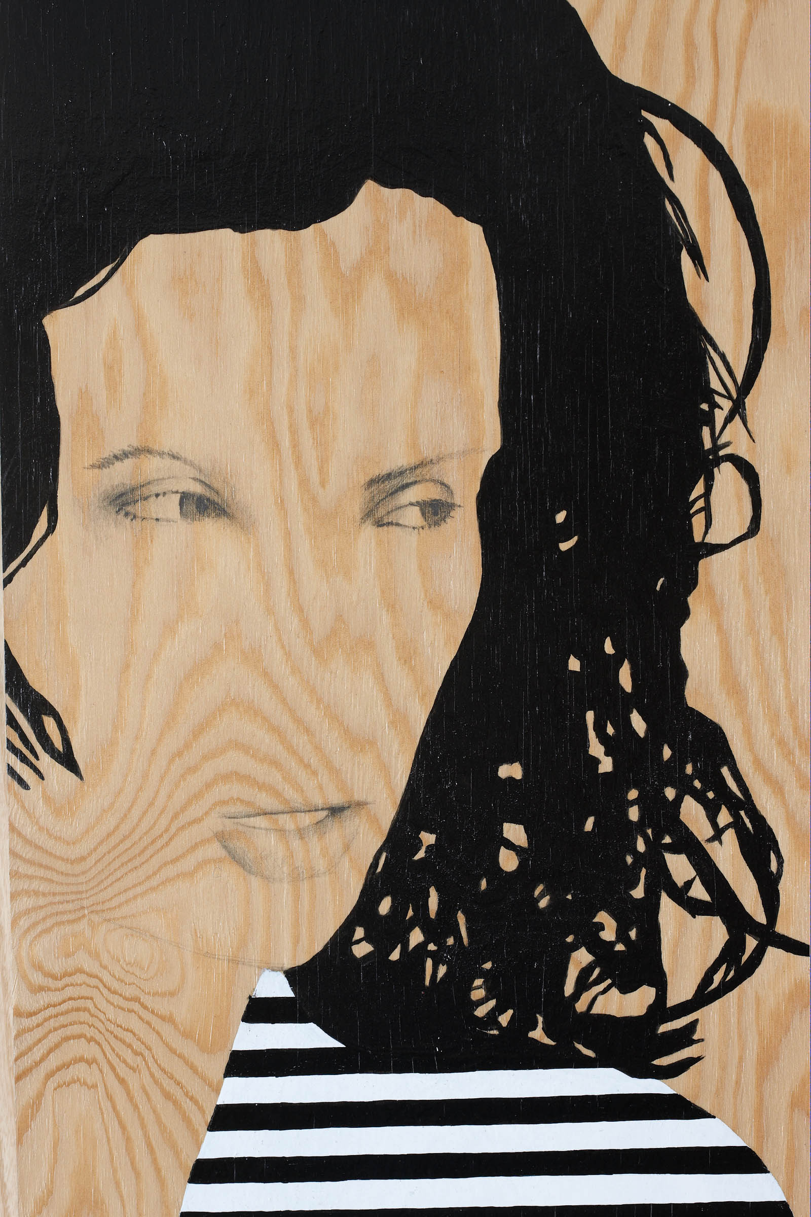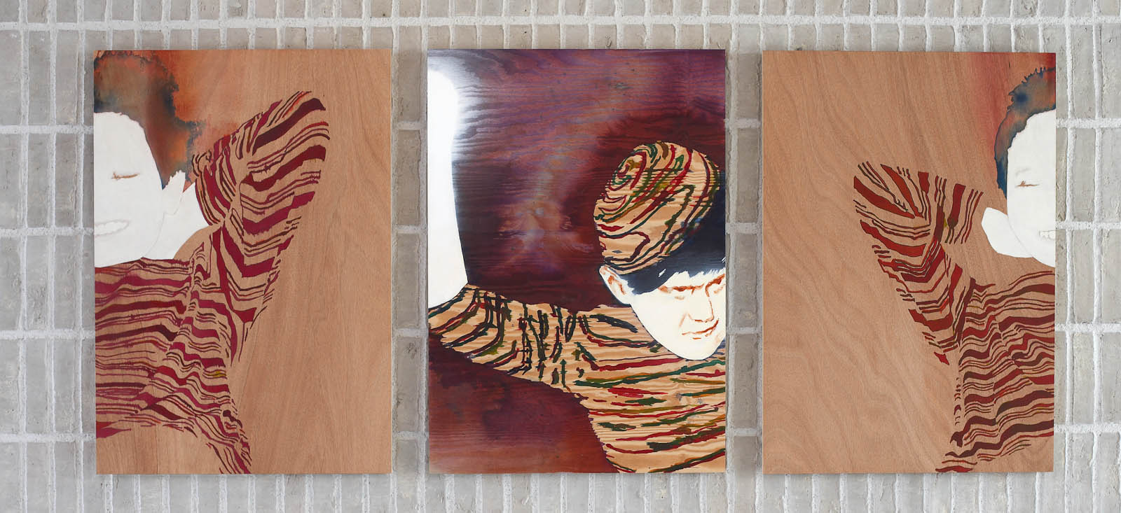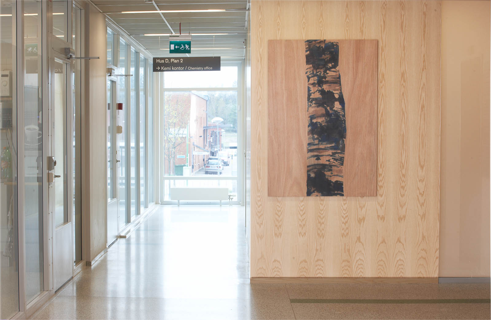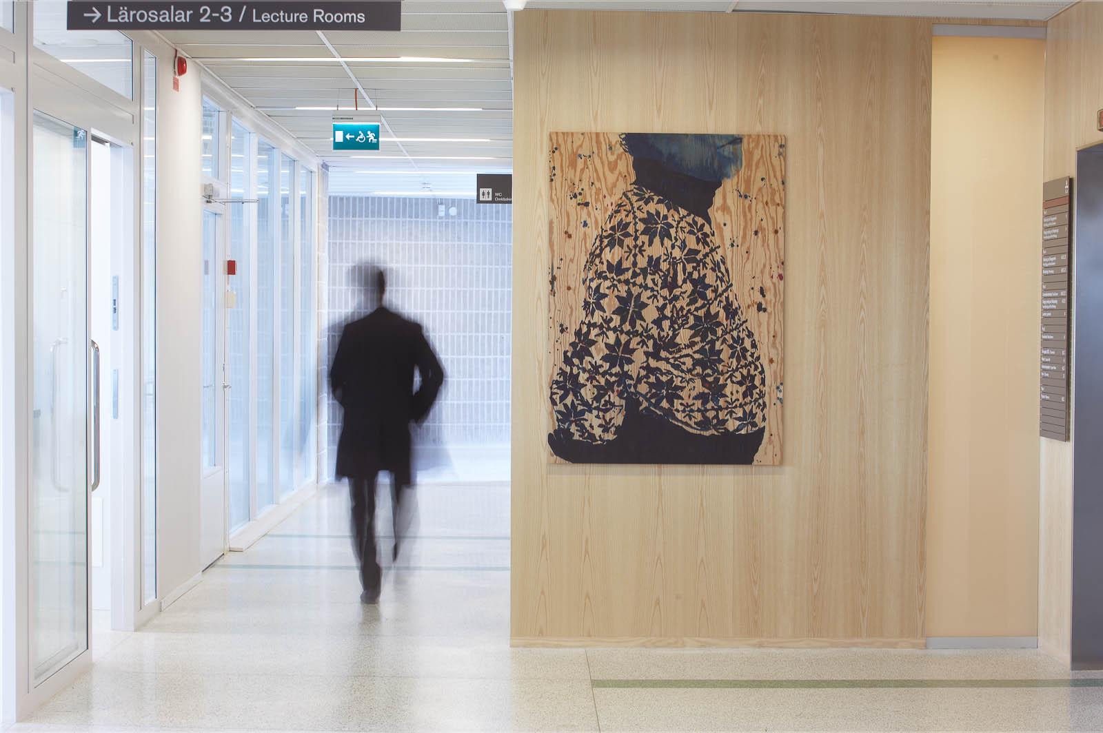 Therefore Lucander paints eyes and mouths, hairdo and clothes, but often leaves out the nose and other facial features, or renders them subtly in pencil hatchings. As he does this straight on to wood (of the type also used for shipping crates), the physical presence the abstracted protagonists are inevitably bereft of is replaced with the physical presence of the wood grain; a replacement that is structurally uncanny – ghosts materialised. At BioCentrum, this effect is further enhanced by the way most pieces are hung straight on to similarly wood-panelled walls of the architecture, or as in the case of a series of three images next to the elevator, are distributed across floors: on the first floor, the naked trunk of a birch; on the second, a smiling woman in a patterned sweater clasping it; on the third, the same motif but differently cropped and mirror inverted. Her grin – just eyes and mouth, isolated – is hard to place, as if shifting from friendly to wicked. Other images include a bearded man in his forties, also wearing a patterned sweater, his facial expression slightly aloof (according to the title, he’s a fågelprofessor, a bird professor); a chubby older guy in a patterned turtle neck; young women in striped or chequered dresses; arms pointing in directions; legs in rubber boots.