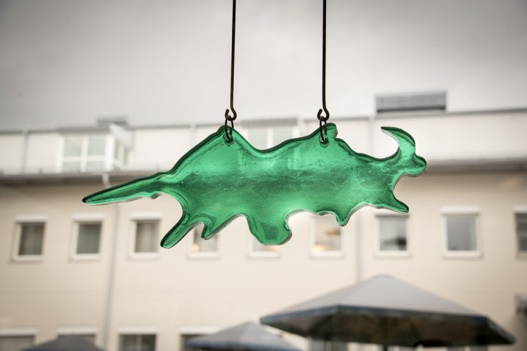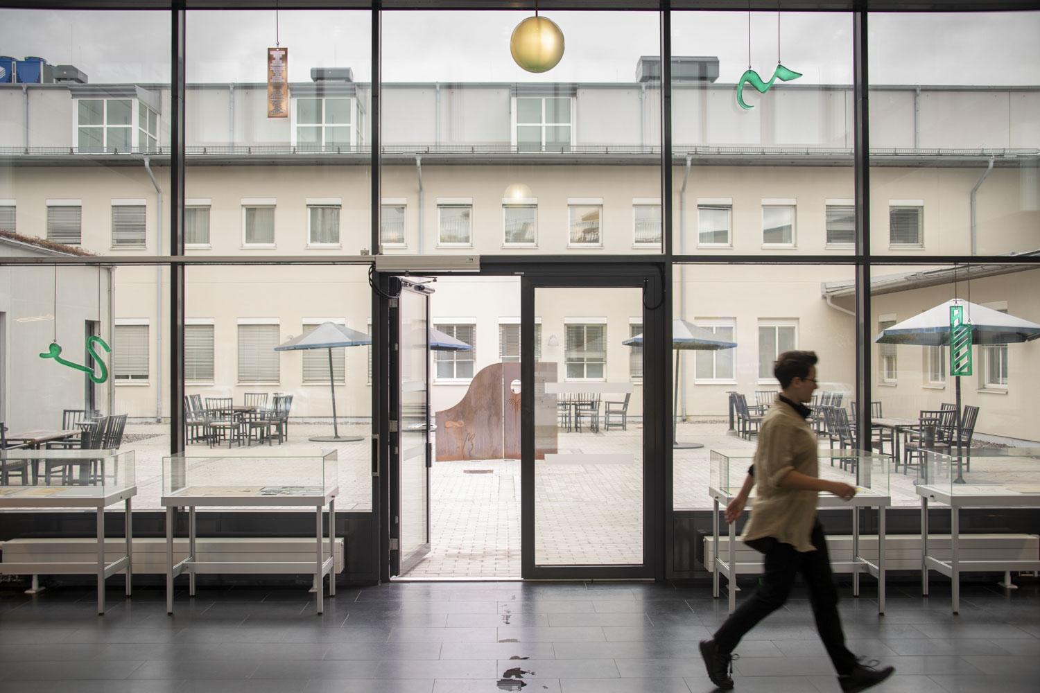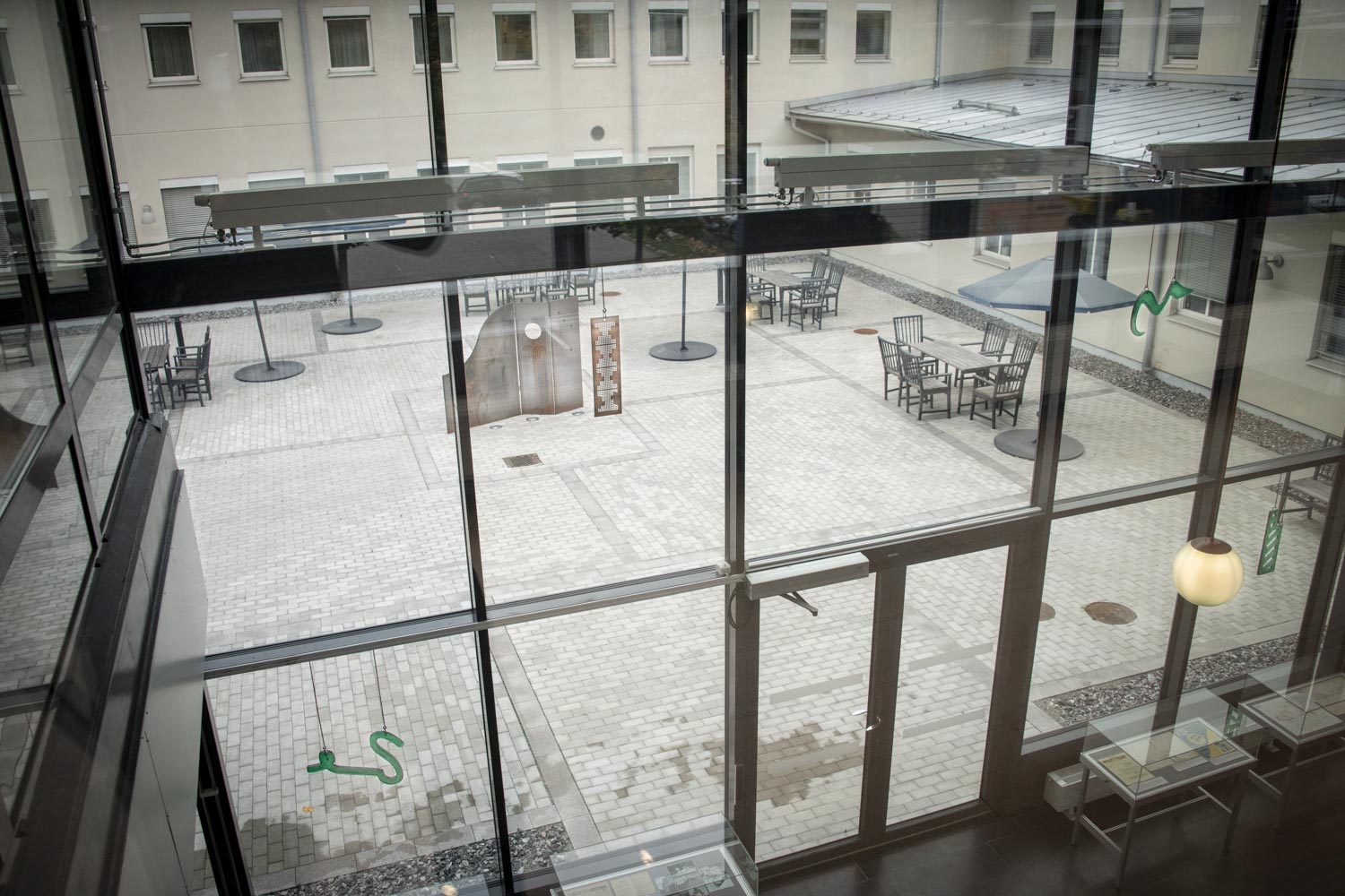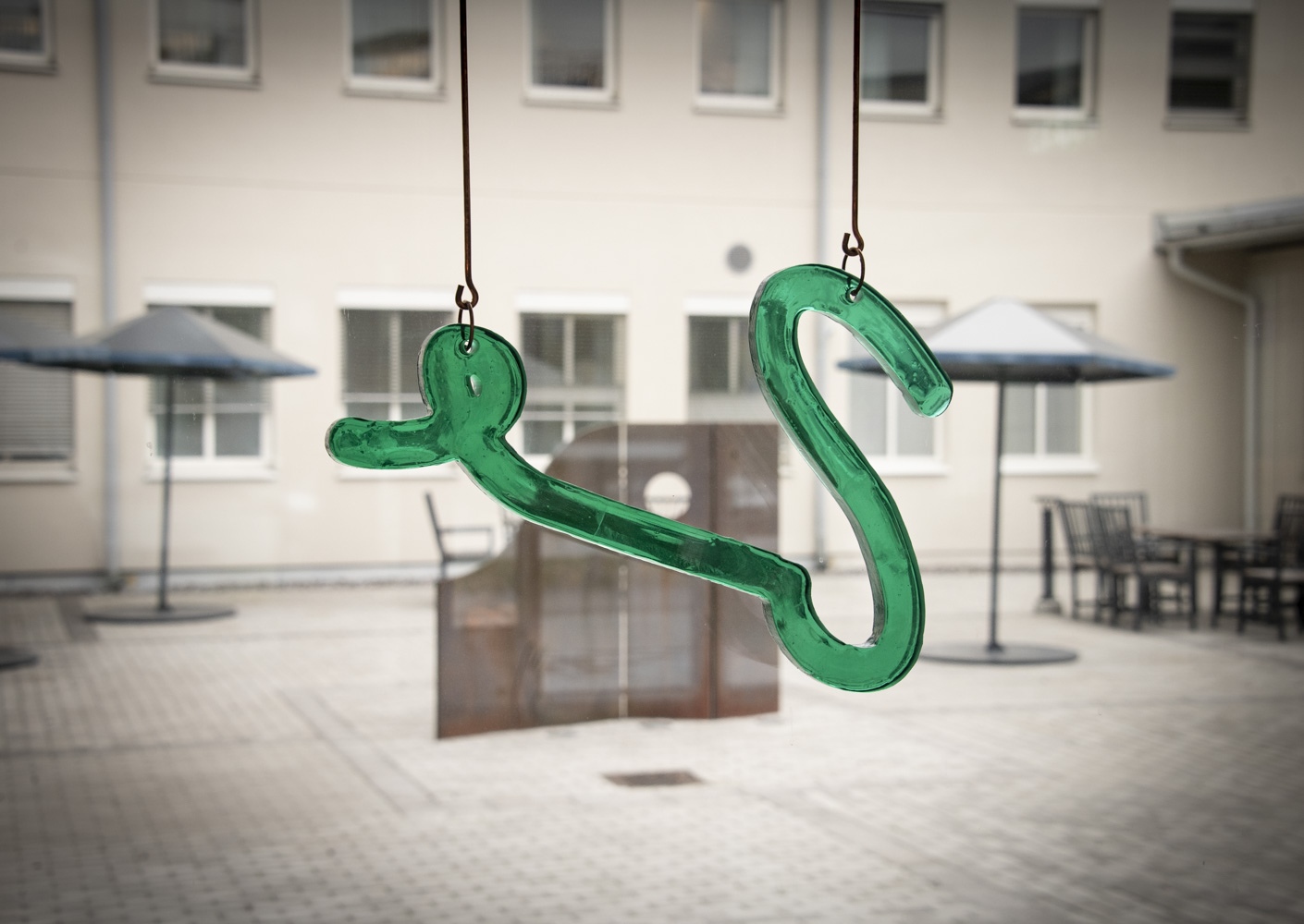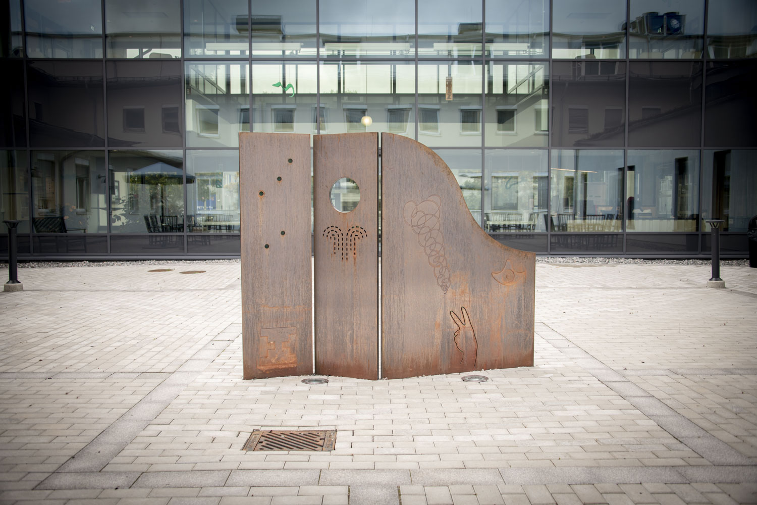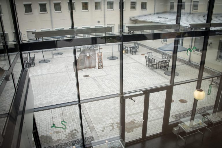 The ceiling lamp sheds light on our history, highlights the importance of “enlightenment”, research and knowledge and demonstrates the value of transparency, which is enshrined in the Principle of Public Access to Official Records. For the artwork suspended in the window facing the inner courtyard, the artists have drawn inspiration from music, dance choreography, movement, telegraphy and code. The form of the sculpture in the inner courtyard is similar to a magazine holder, the larger scale of which creates a room or an arbour. Perforated holes in the sculpture give a sense of transparency and are reminiscent of a loom and a computer’s punch card.