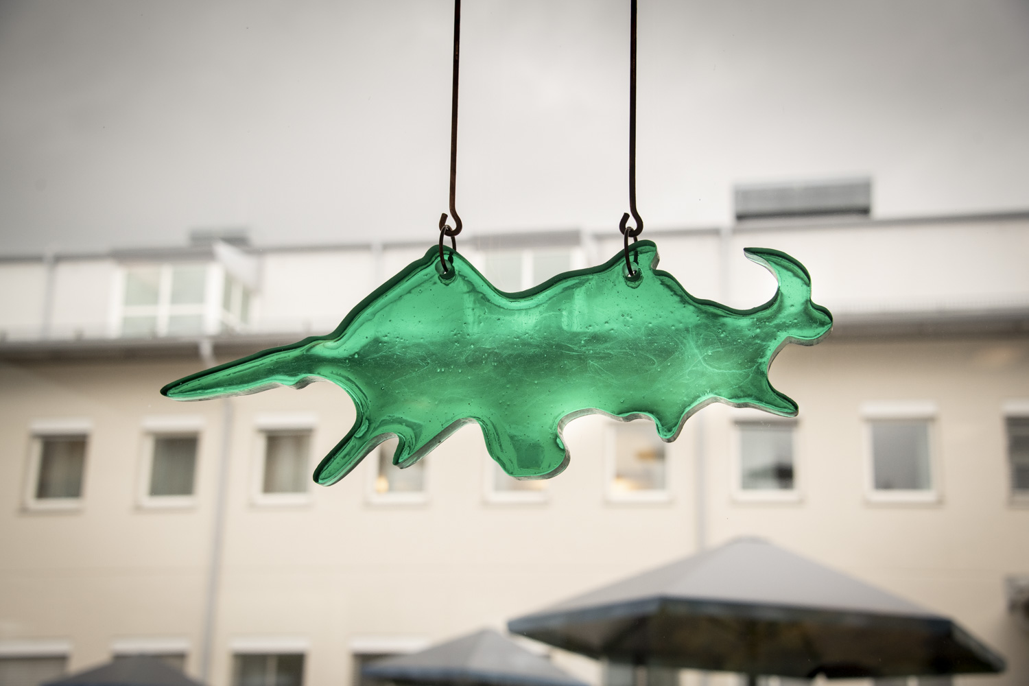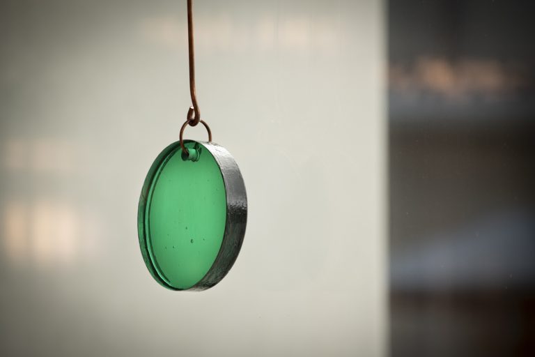 Suspended in the large window facing the inner courtyard are objects of green glass and copper that form keys or an alphabet to decipher the artists’ interwoven archival contemplation. The architecture is like a showcase in which they have compiled the most innovative and varied ways of communicating. All these forms create a patchwork story, a hodgepodge in which each tiny sign from the various alphabets provide an opportunity for new stories.