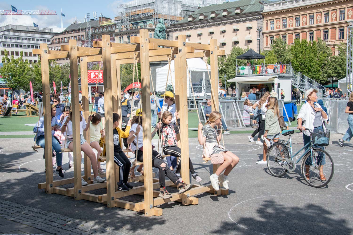 Familiar objects like skipping ropes, math compasses and swings are integrated in various kinds of utility systems, where coordination and collaboration between the individual participants becomes imperative. The participant’s motor skills are challenged as well as their ability to coordinate group movements in order to make the optimal systems in the coordination models work. When this succeeds a common rhythm is generated that transforms the utilities from commonplace play objects to complex collaboration modules, where the individuals in the group are dependent on each other.