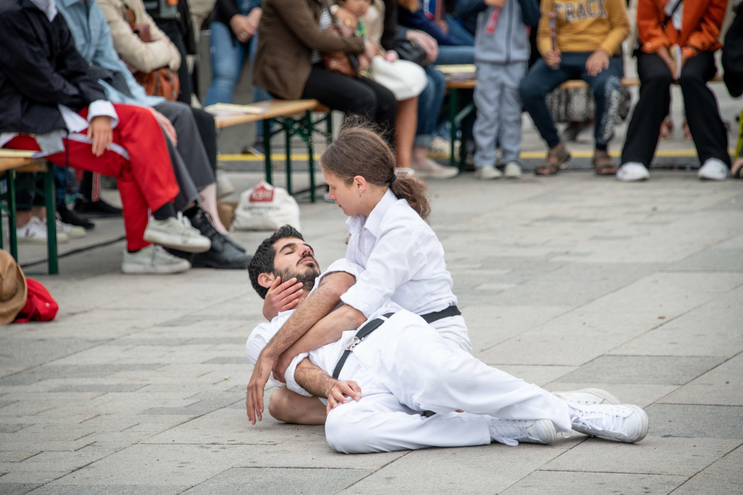 Emergency Routine activated civil alliances as they are performed between bodies in moments of threat. Echoing the state’s elusive hand that reaches and touches the citizen under the auspices of protection, the exercise invited passers-by to be carried away, allowing physical touch and bodily manipulation, to experience imaginary and documented acts of violence, and choreographies of compassion.