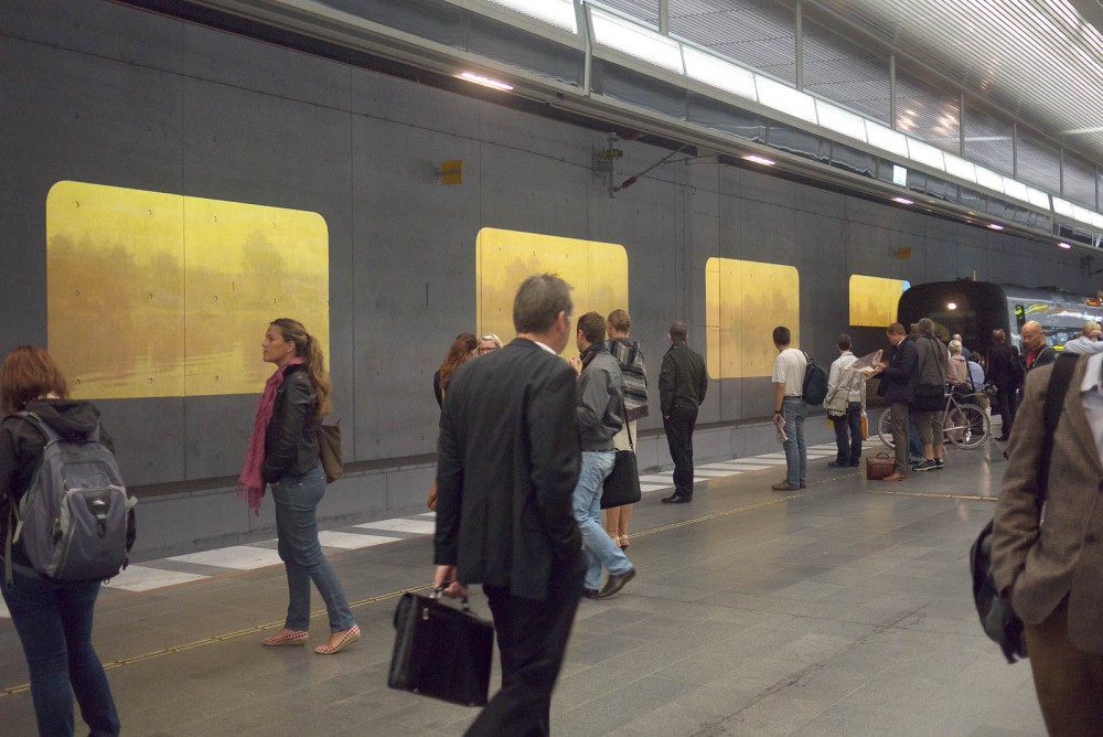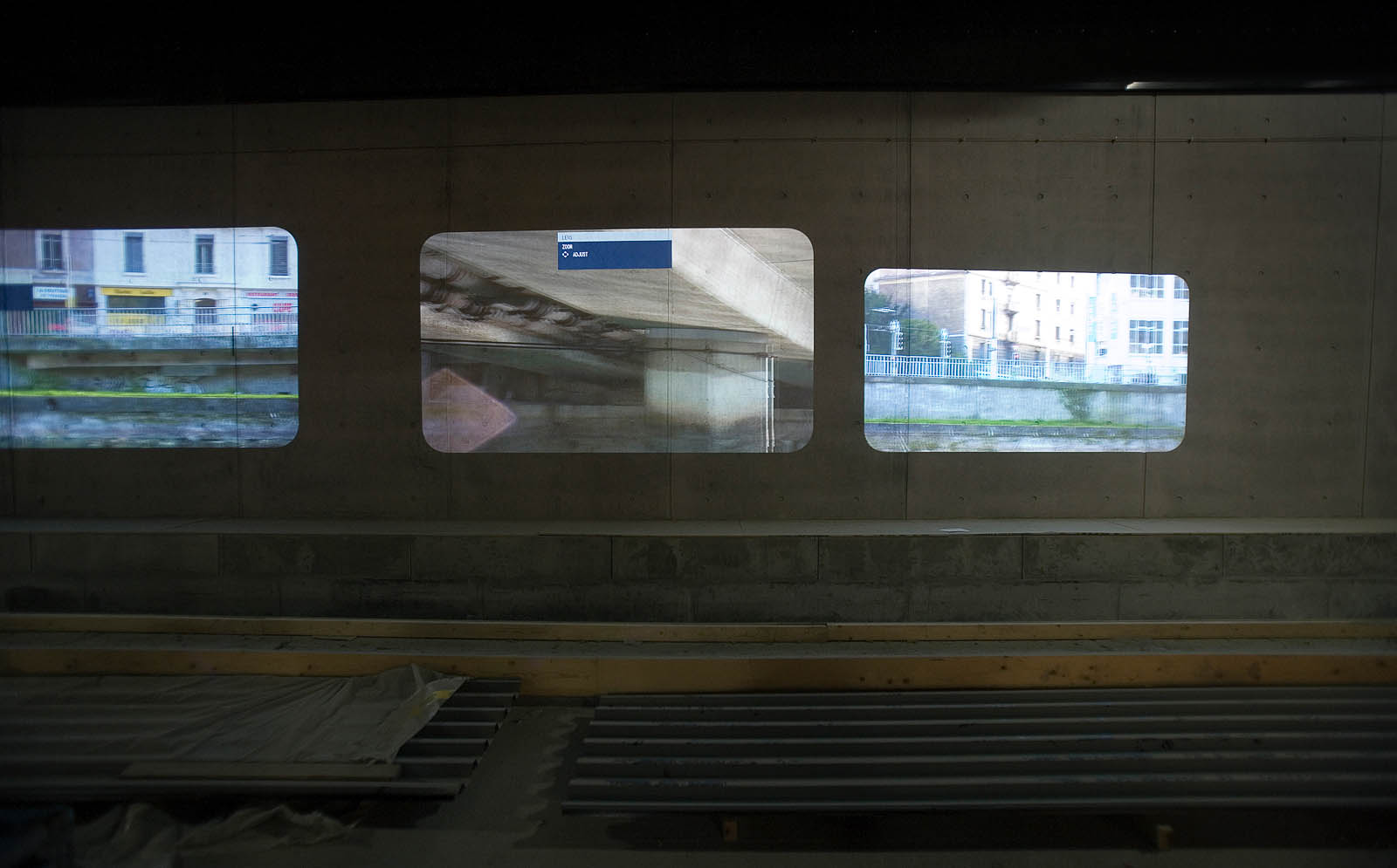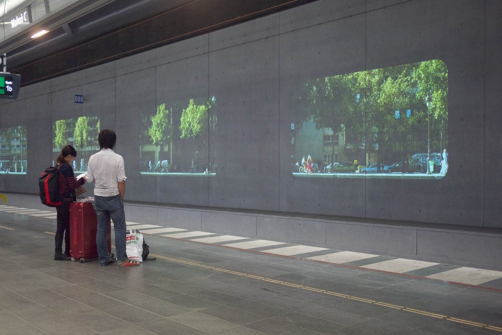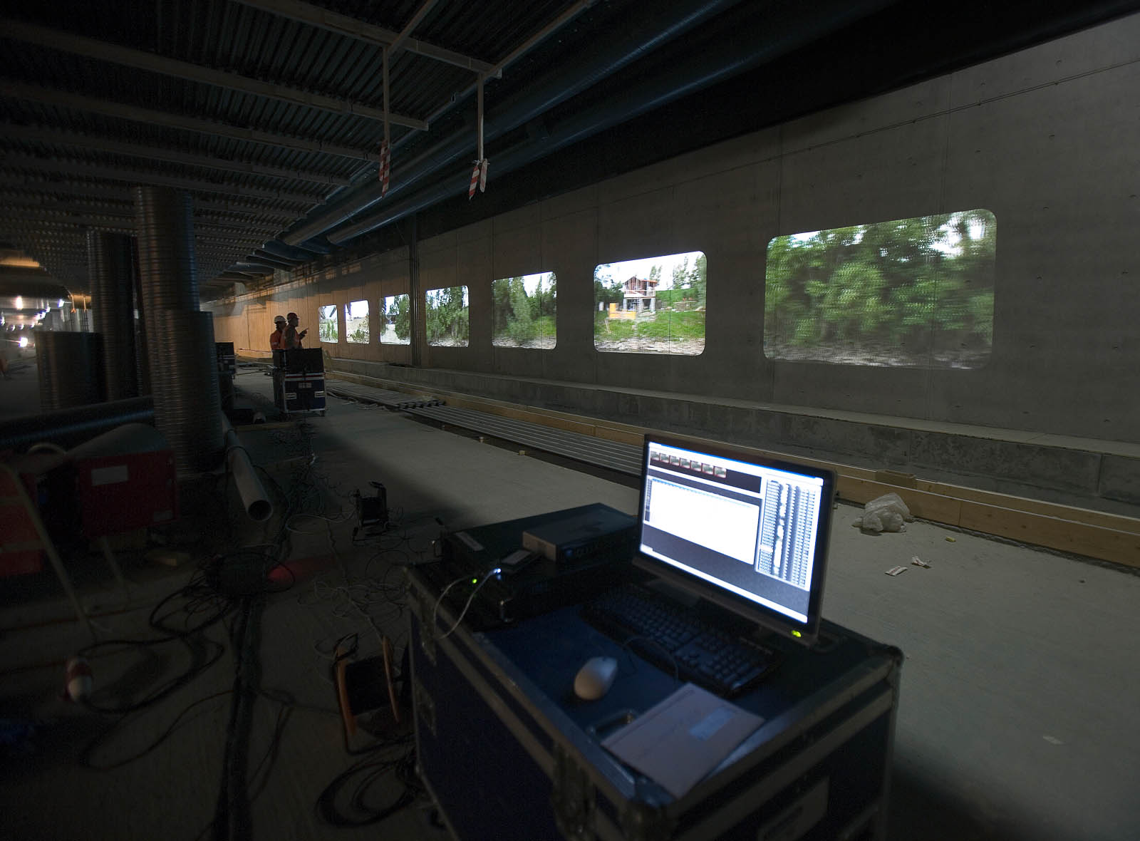 Tania Ruiz Gutiérrez has used a monu­mental video installation to transform the room at Malmö Central Station into the interior of an enormous train coach. Fourty-six large images in the shape of train windows are projected onto the north and south outer walls. A total of 1200 joined film sequences taken from boats, trains, buses, cars; vehicles generating a horizontal movement, hover and fill the surfaces. The illusion is so overpowering that we experience how the subterranean Malmö Central Station detaches itself and moves through the world, like an autonomous vessel. We could, of course, scrutinise the illusion and try to disassemble its various parts. The astute observer will discover a subtle yet distinct splice that regularly cuts through the train window/image. This happens when the film cuts from one sequence to the next. Moreover, the intensity of the colours makes the images look like animations, and the natural shakiness and vibrations of the voyage have been levelled out entirely. The images are projected directly on the concrete wall, giving a fresco-like texture to the surface.