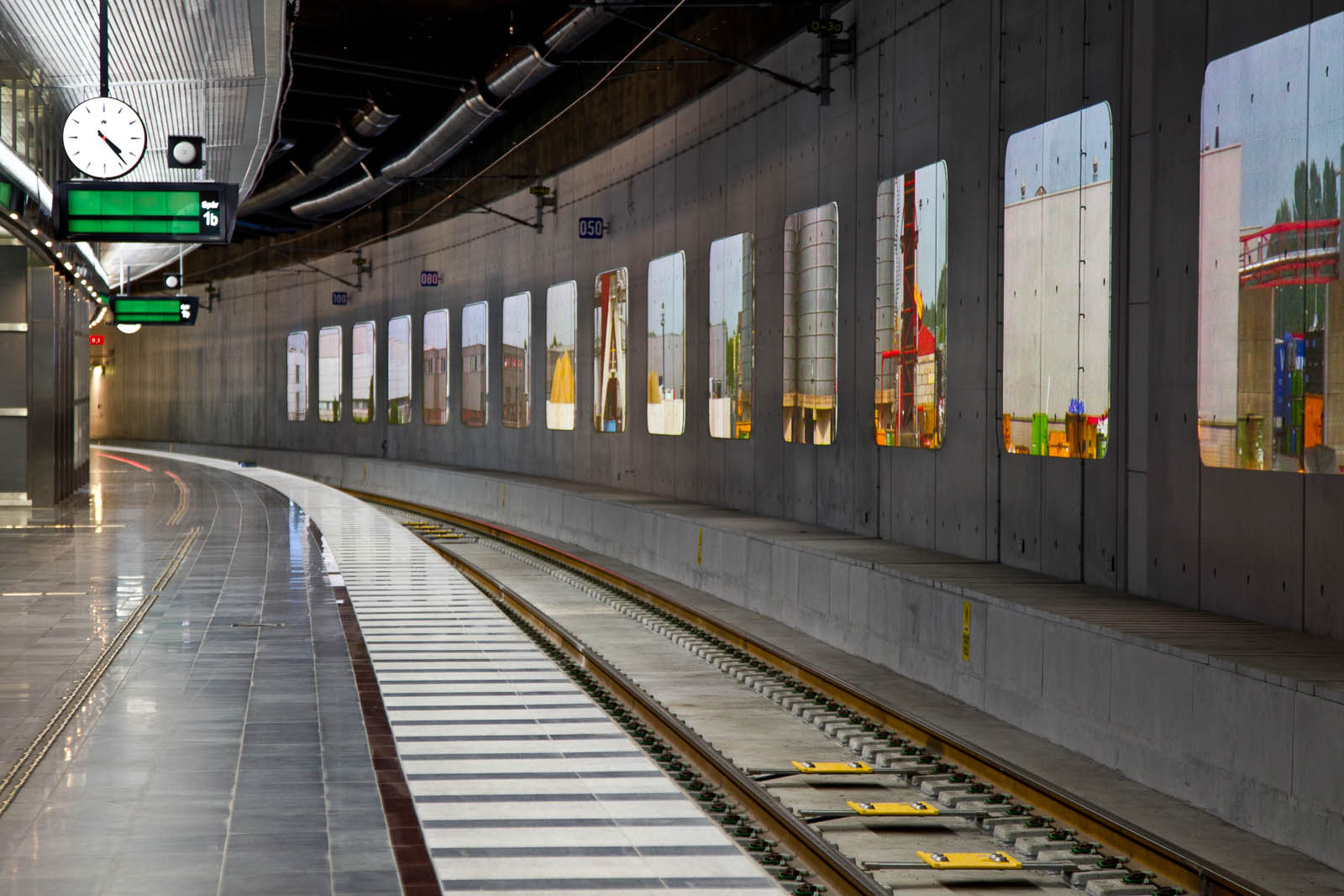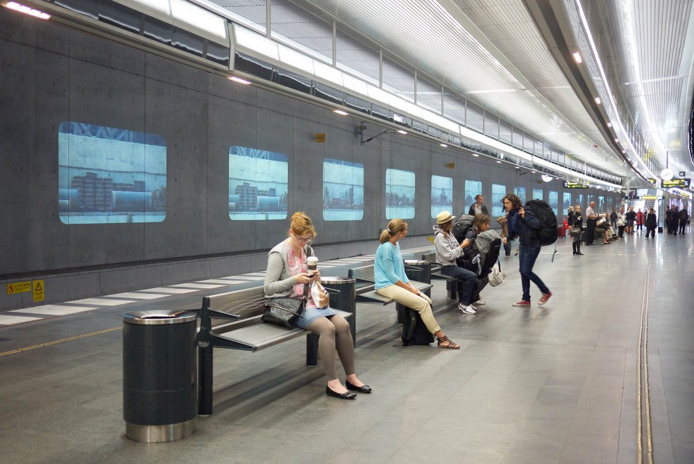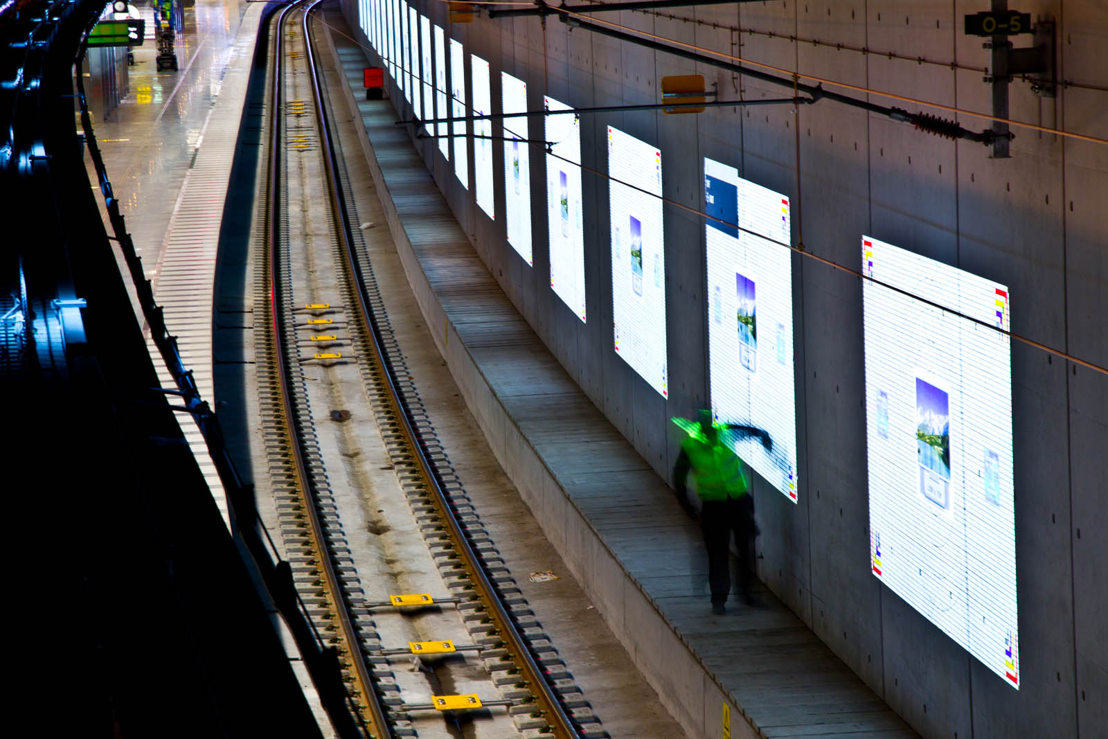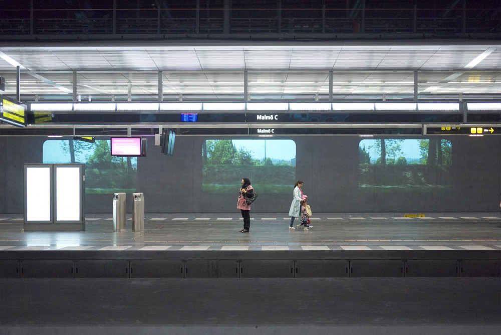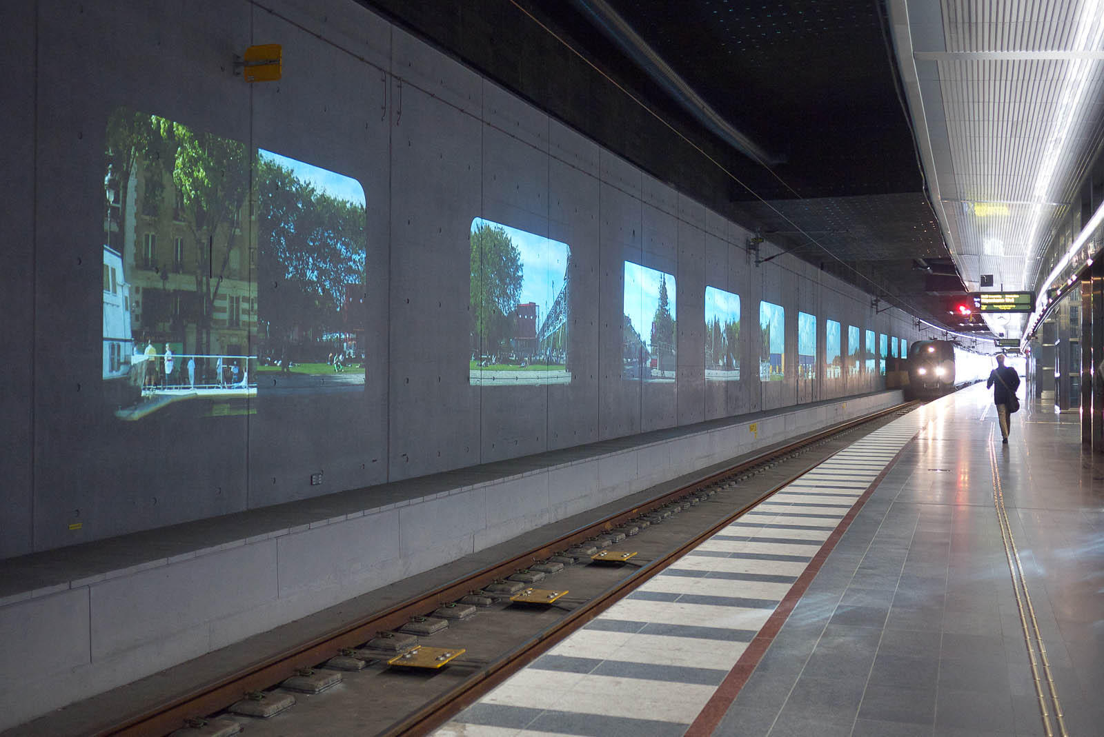 Malmö 2010. Tania Ruiz Gutiérrez videoverk Annorstädes strax efter invigningen i Citytunneln i Malmö.