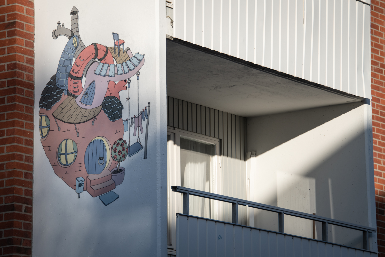 The artist Santiago Mostyn’s eight-meter-high light sculpture Mirakel is both a statement and a question. The miracle is here, but what do miracles signify? The facades of the apartment buildings bear images by the illustrator and comic book author Kalle Landegren that interprete some of the locals’ stories of what a miracle is for them and give each apartment block an identity of its own.