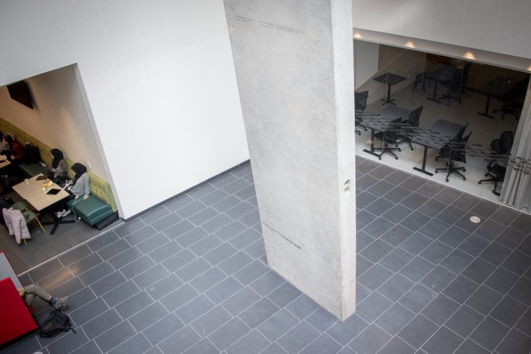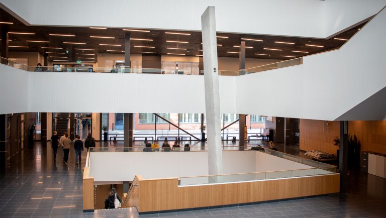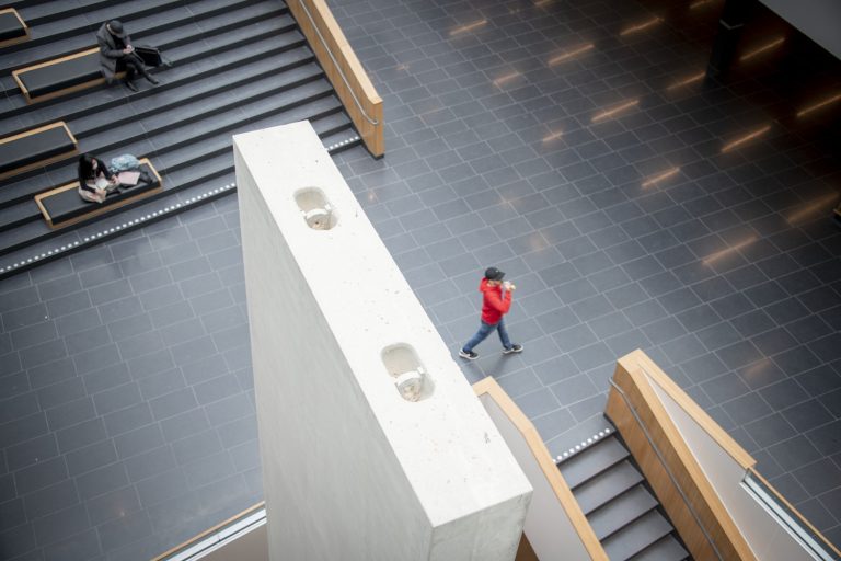 The artistic intervention IO in the Ångström Laboratory at the University of Uppsala is a sculpture in the form of a gigantic concrete block. It extends from the ground floor of the building, through an opening on the entrance floor up to the second floor. Leaning slightly, the sculpture creates a vertical and horizontal contrast to the existing architectural lines. Through its placement and size, the sculpture appears familiar, as if it were a building element. At the same time it conveys a feeling that something is wrong – foreign, misplaced, inside out, forgotten, built in. The work IO is a monumental reminder of the meaning of mistakes, errors, disturbances or glitches.