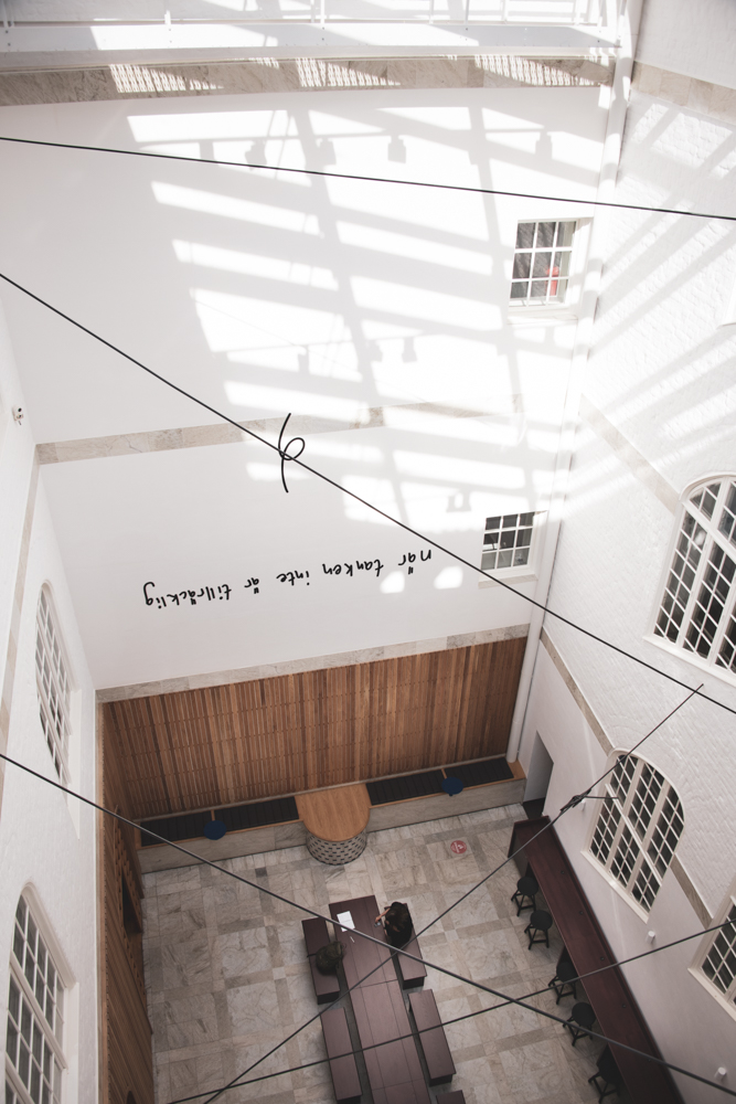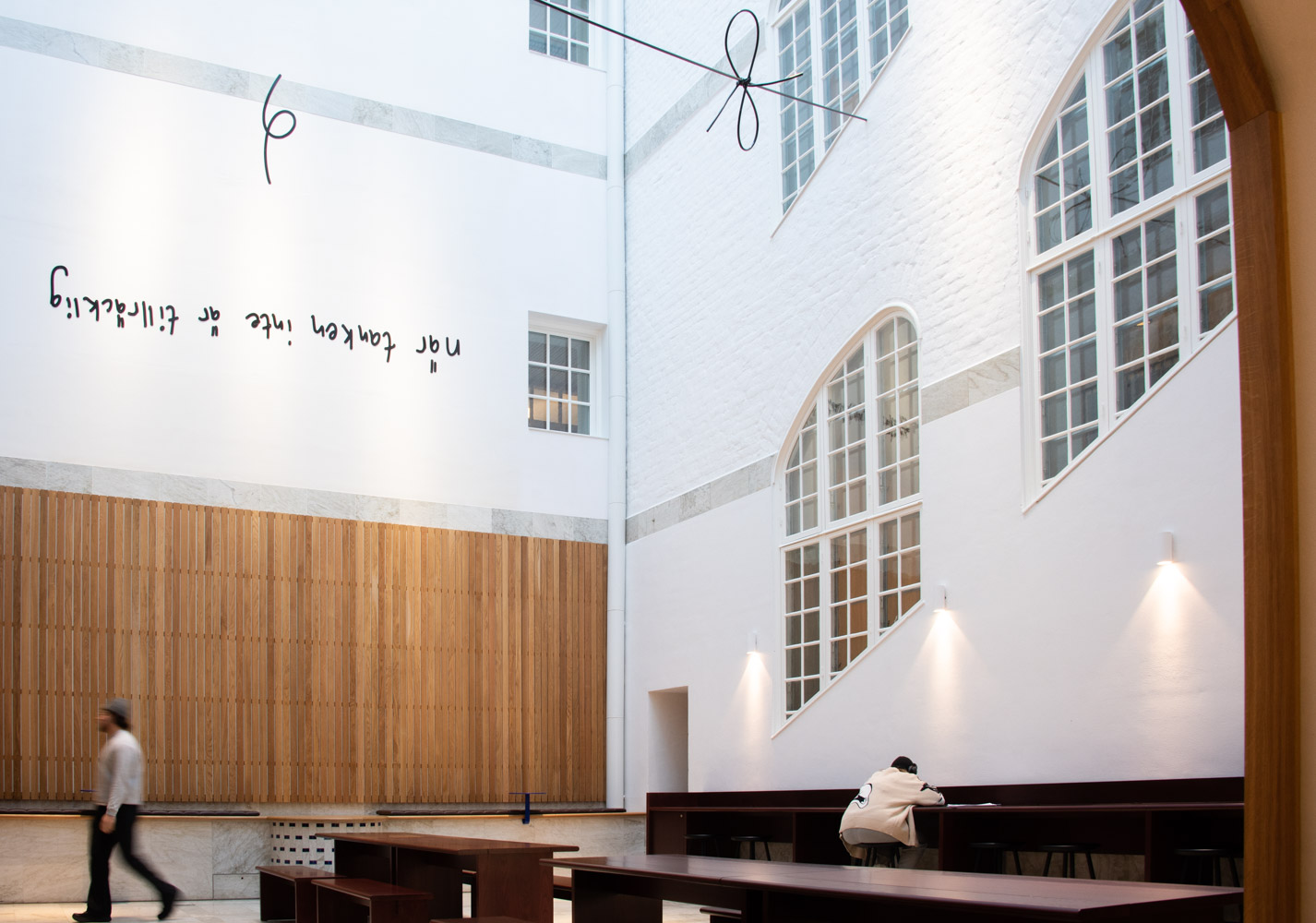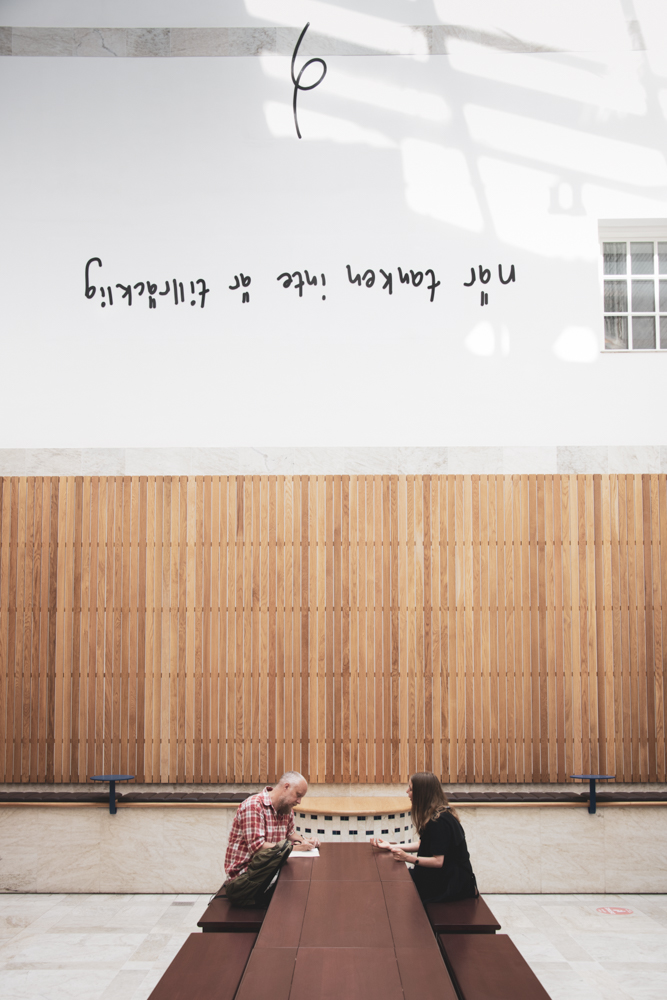 När tanken inte är tillräcklig/ When Thinking Is Not Enough can be found on the walls and in the air of a light atrium at KTH Royal Institute of Technology. Reminiscent of thoughts that run, bind together and tie themselves in knots, the artwork merges with the architecture of the light atrium. Existing at the intersection of art and research, When Thinking Is Not Enough is a tribute to exploration that reverses the perspective in the search for new knowledge. It attempts to make us reach beyond that which we already know and take for granted. To twist and turn and question the accepted.