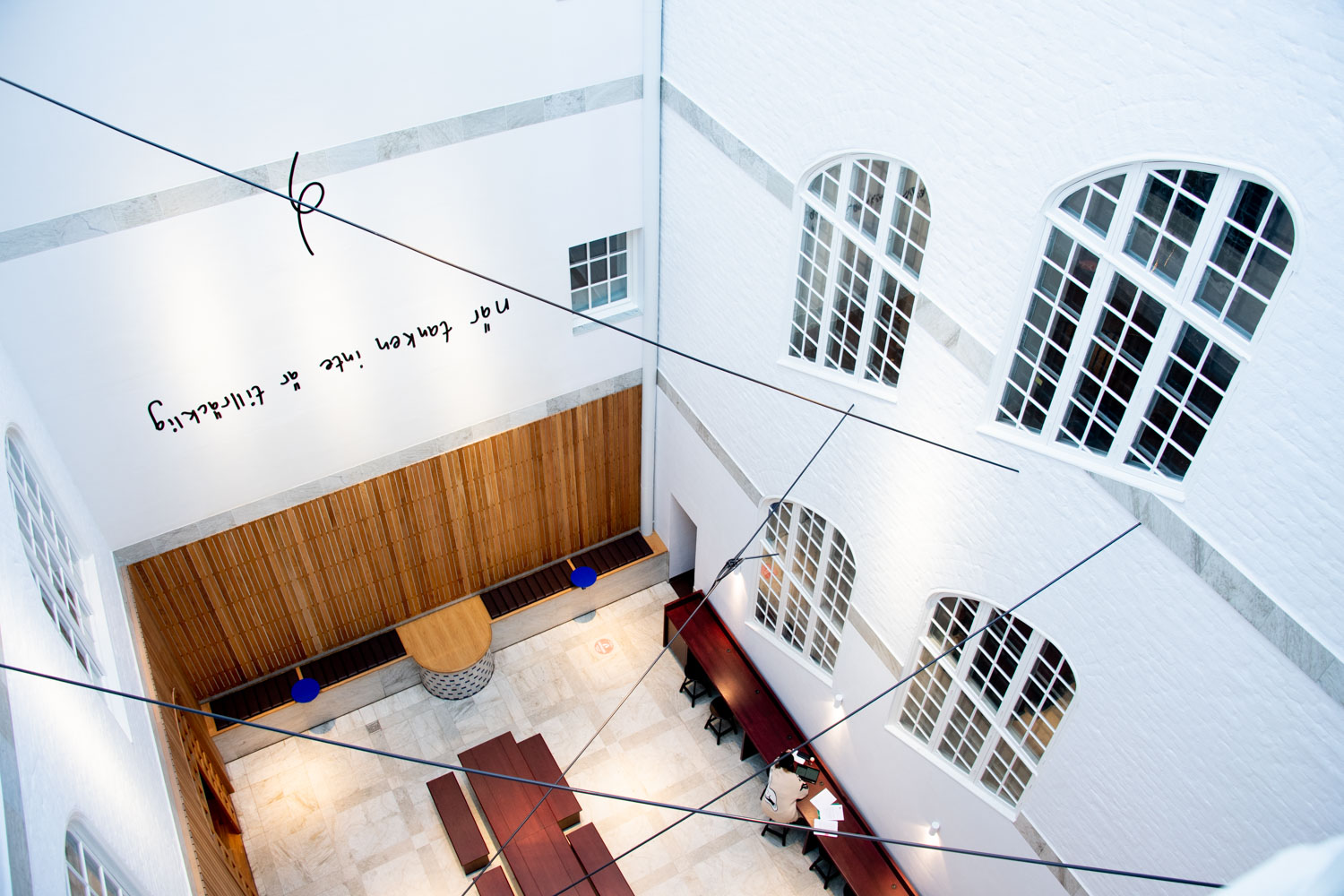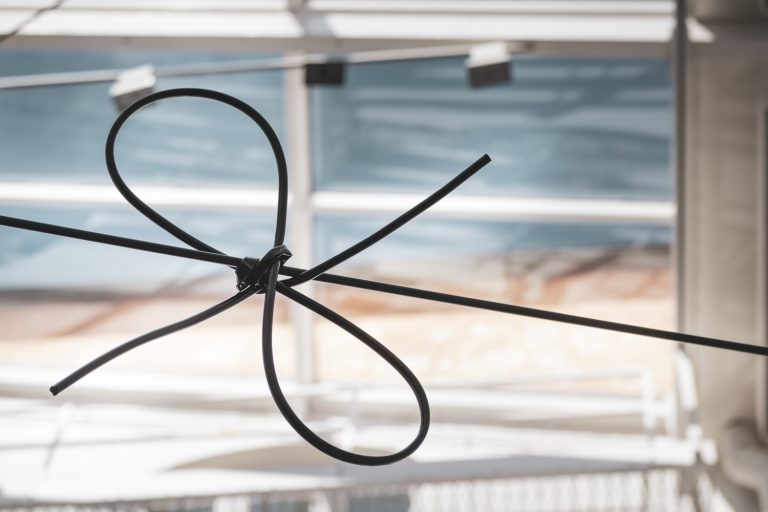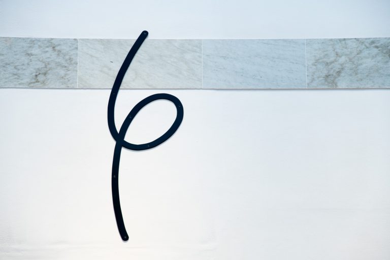 Thierfelder Tzotzis’s artistic intervention cuts through the air and can be found on the walls, in order to stand out against the special architecture of the light atrium. It is reminiscent of thoughts that run, bind together and tie themselves in knots. The work attempts to make us reach beyond that which we already know and take for granted. To twist, turn and question that which we perhaps all too often take for granted.