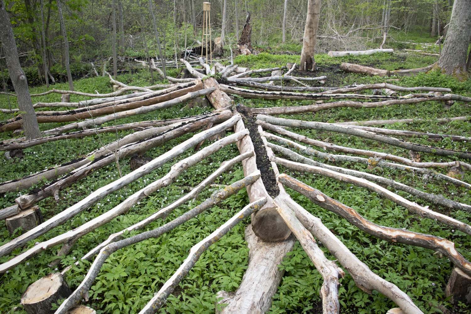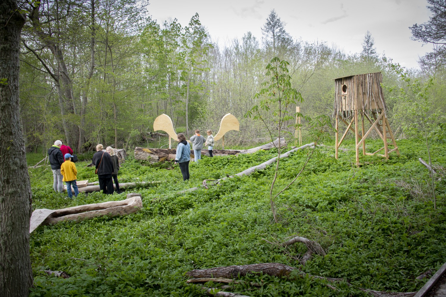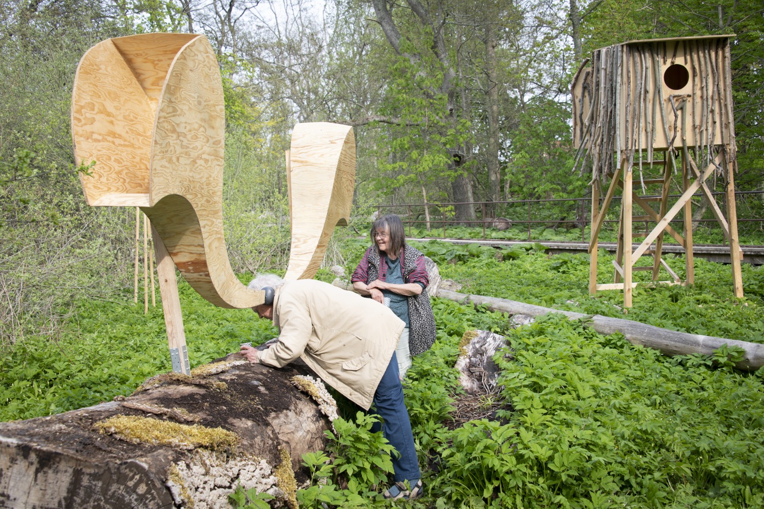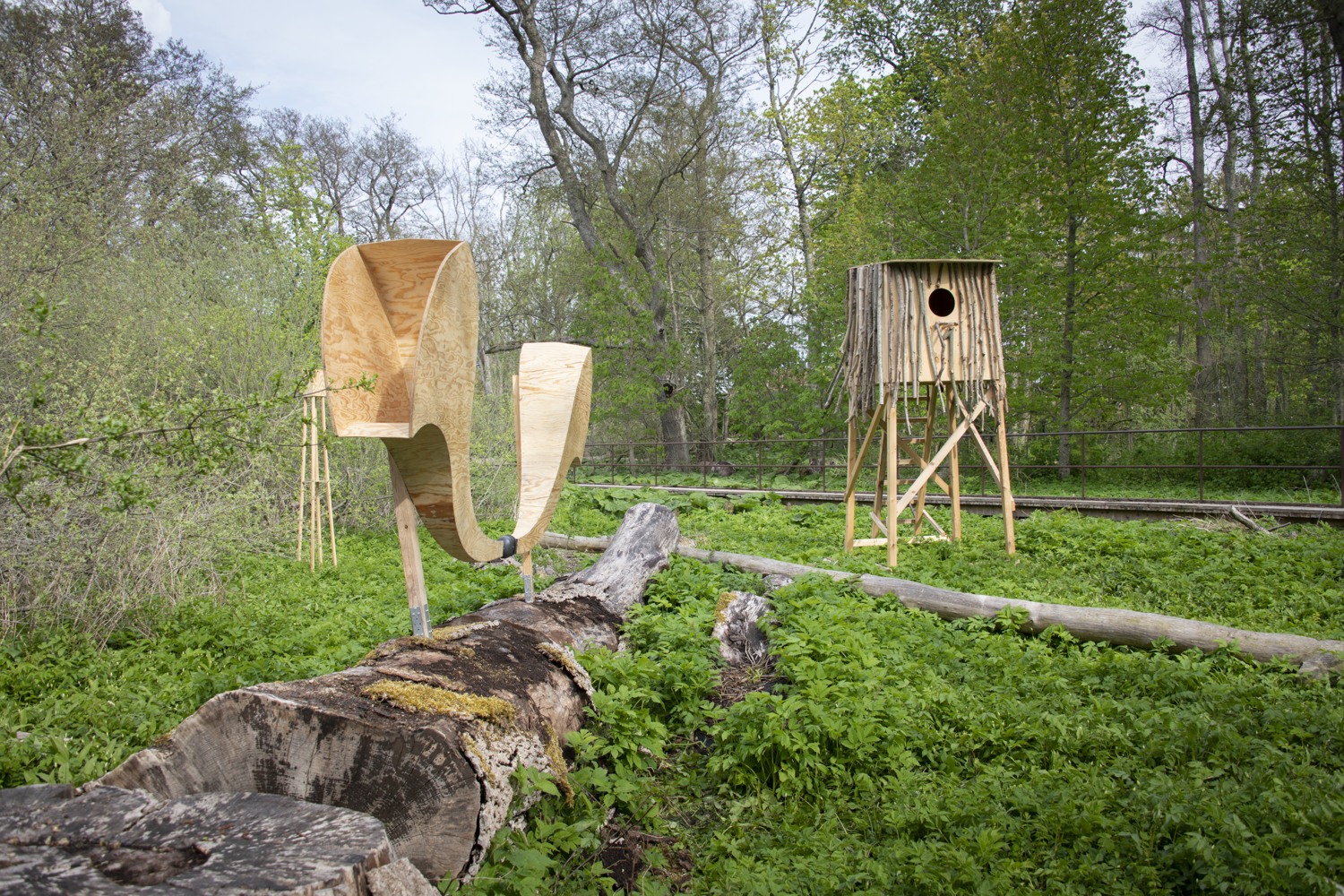 The artists use debarked elm tree branches to create a gigantic sculpture with several elements that mimic the pattern the bark beetles leave on the elm tree trunk. Hollowed branches filled with soil are transformed into “tables”, with plants from the area growing from their carved bodies, creating a banquet for insects, beetles, birds and other organisms. Other logs are turned into water basins and insect hotels, surrounded by birdhouses and miniature huts for rabbits. Among them appear a hilarious painting full of colors, an oversized birdhouse and a pair of gigantic listening horns resembling moose ears. We’re invited to come close and use them to sense the surroundings, listen to the sounds of the forest and experience the world from the other species’ perspective.