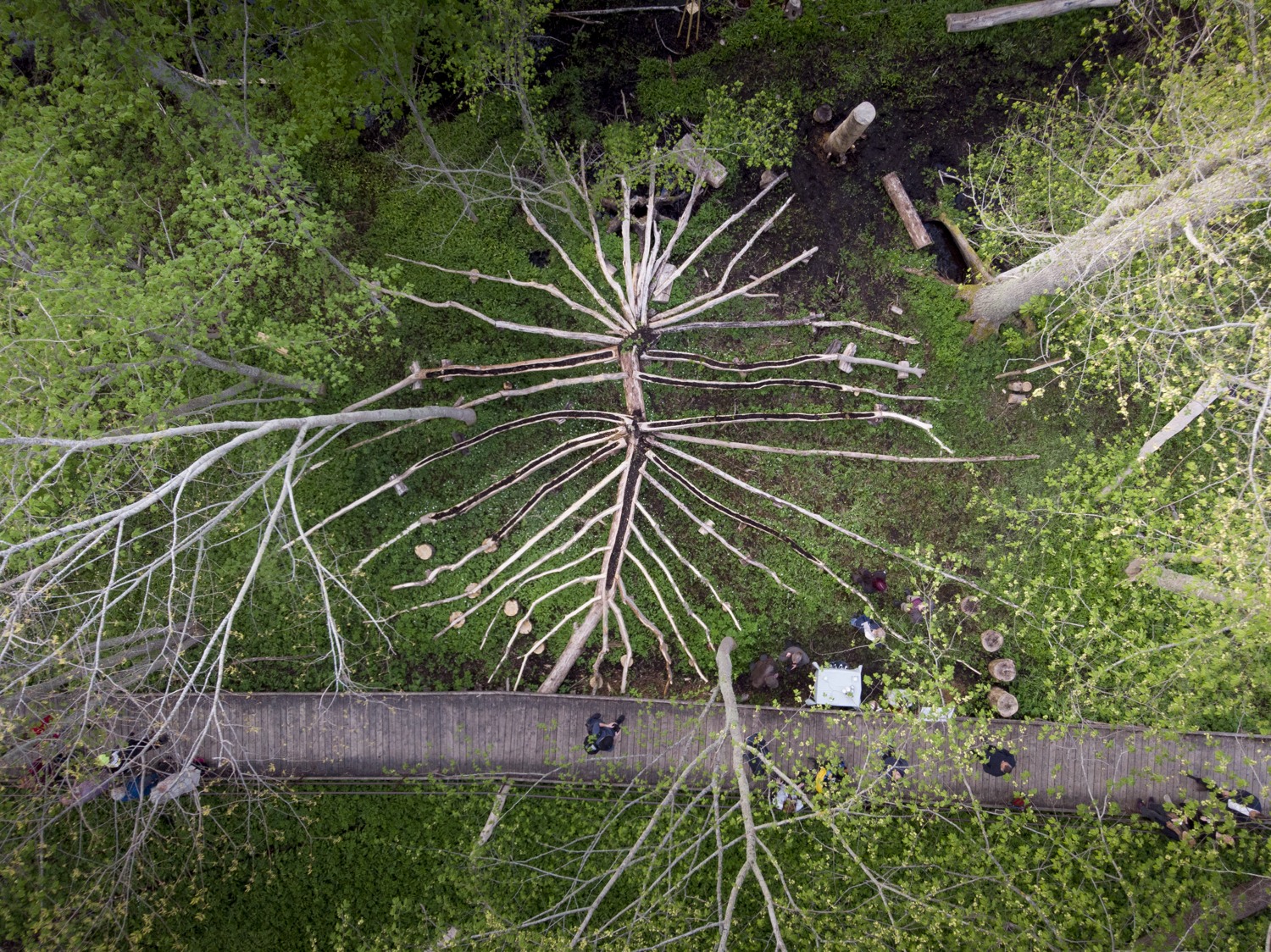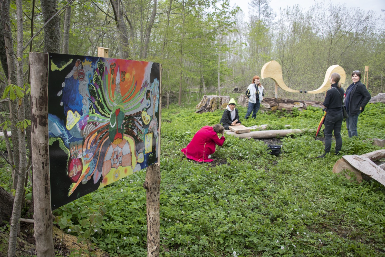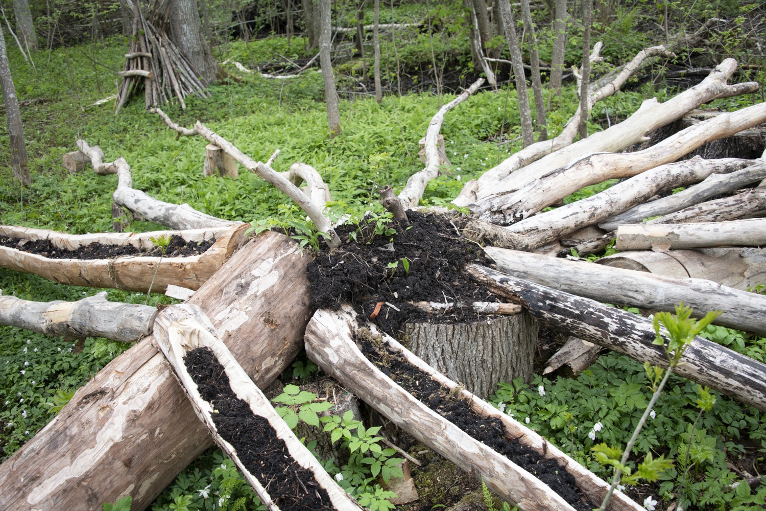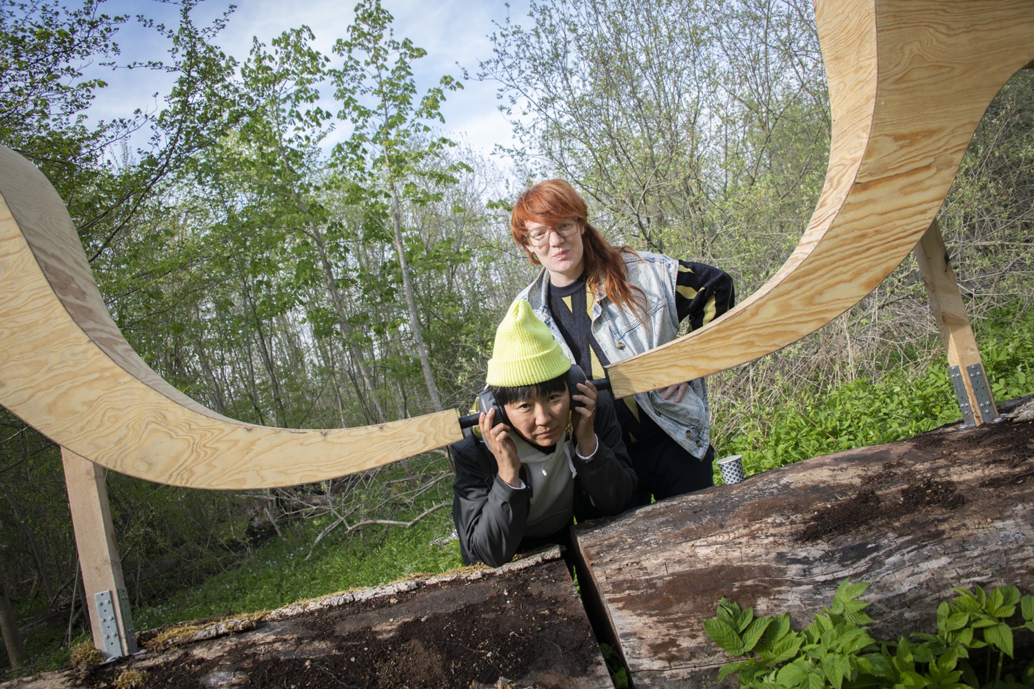 The artists use debarked elm tree branches to create a gigantic sculpture with several elements that mimic the pattern the bark beetles leave on the elm tree trunk. Hollowed branches filled with soil are transformed into “tables”, with plants from the area growing from their carved bodies, creating a banquet for insects, beetles, birds and other organisms. Other logs are turned into water basins and insect hotels, surrounded by birdhouses and miniature huts for rabbits. Among them appear a hilarious painting full of colors, an oversized birdhouse and a pair of gigantic listening horns resembling moose ears. We’re invited to come close and use them to sense the surroundings, listen to the sounds of the forest and experience the world from the other species’ perspective.