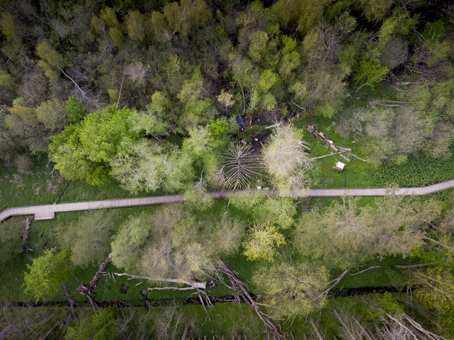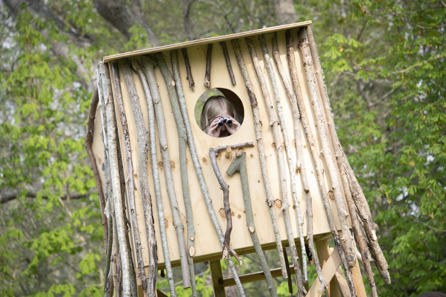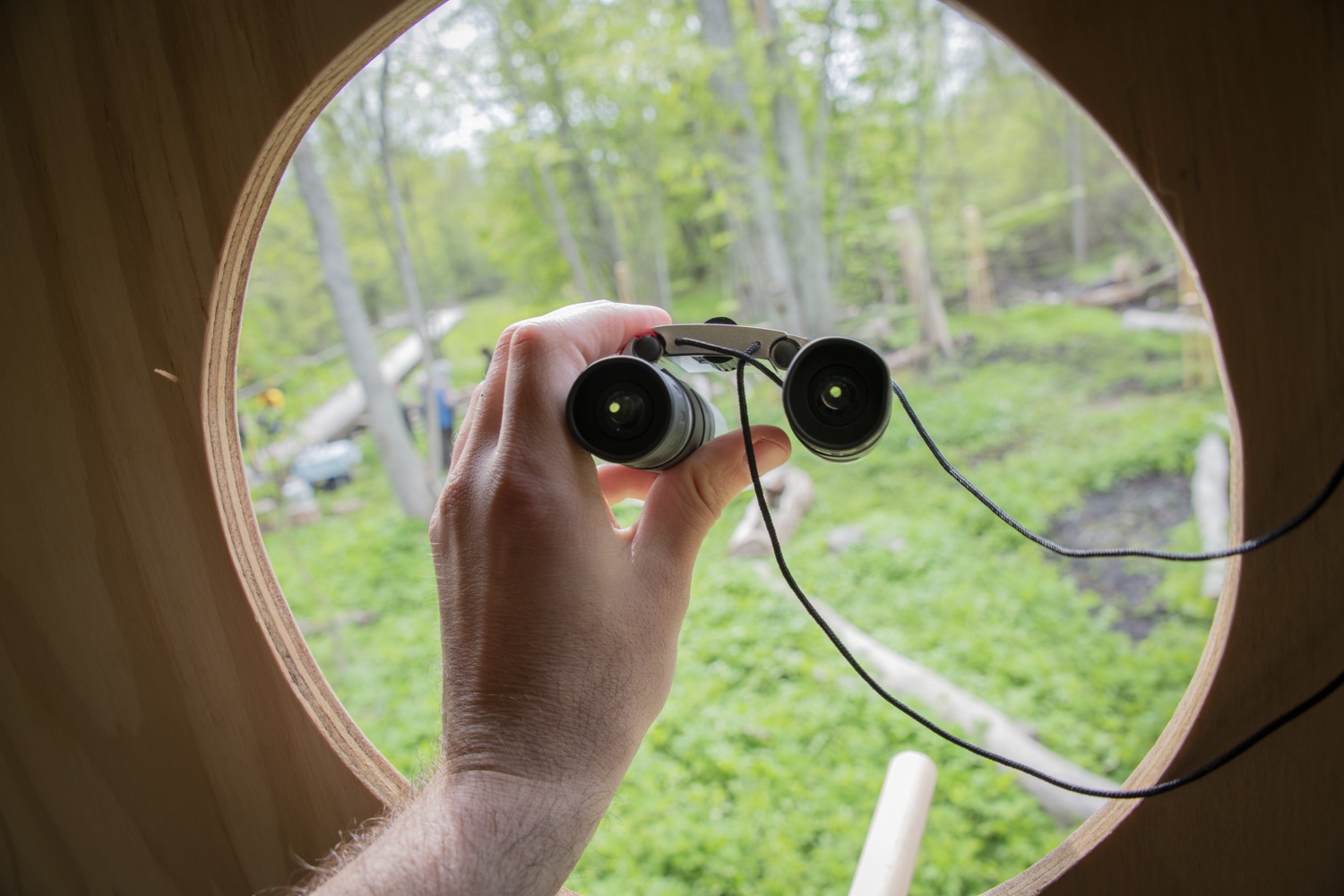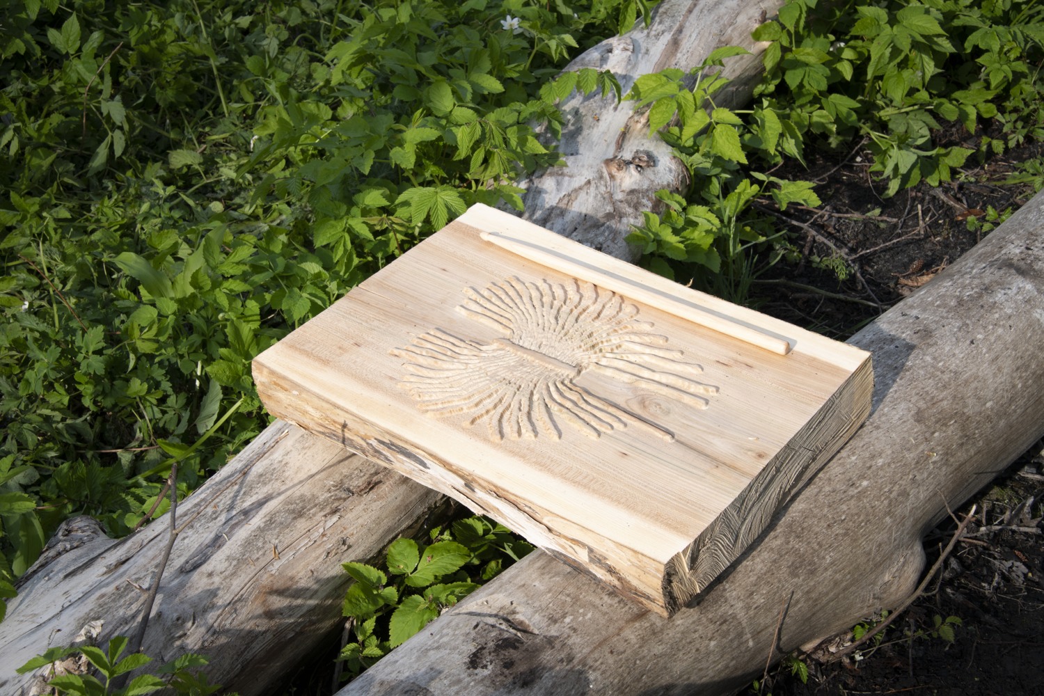 The artists use debarked elm tree branches to create a gigantic sculpture with several elements that mimic the pattern the bark beetles leave on the elm tree trunk. Hollowed branches filled with soil are transformed into “tables”, with plants from the area growing from their carved bodies, creating a banquet for insects, beetles, birds and other organisms. Other logs are turned into water basins and insect hotels, surrounded by birdhouses and miniature huts for rabbits. Among them appear a hilarious painting full of colors, an oversized birdhouse and a pair of gigantic listening horns resembling moose ears. We’re invited to come close and use them to sense the surroundings, listen to the sounds of the forest and experience the world from the other species’ perspective.