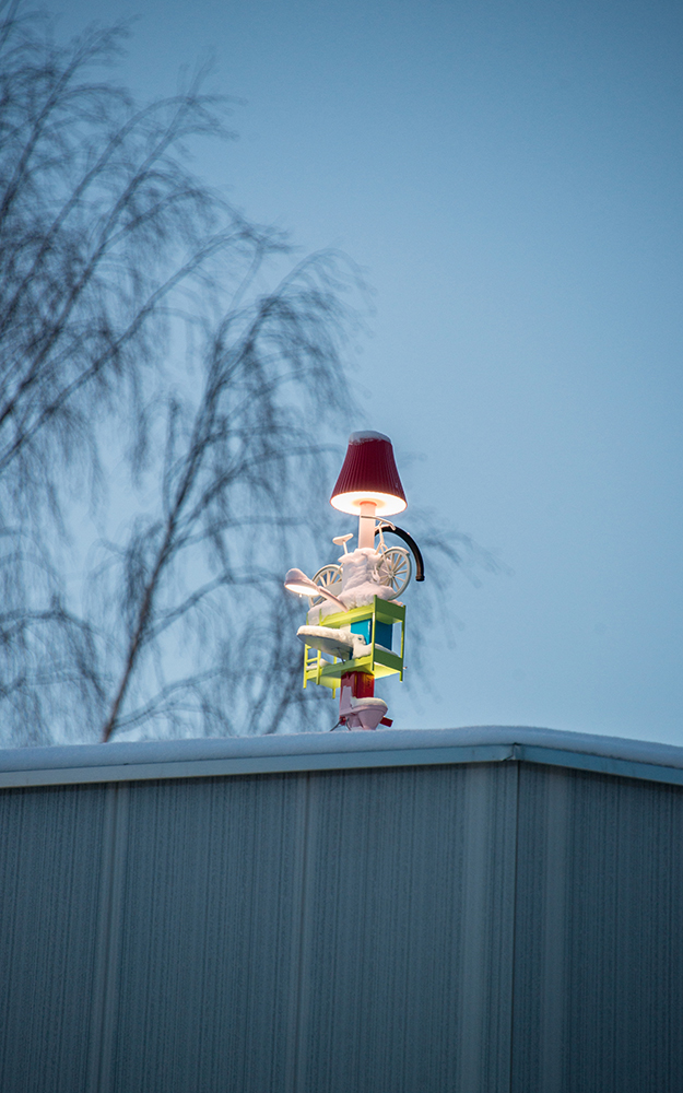 The Court of Appeal for Northern Norrland in central Umeå has changed its distinguishing feature with a new expansion of its building. A snow-white pavilion along the street level marks a clear break with the older architecture. Behind the pavilion, one finds a 1880s neo-Renaissance building, where judicial proceedings have been taking place for decades. When visitors step into the new foyer, the room spreads out formally and strictly. The pillars in the room are so functionally shaped that they can be experienced as black vertical lines. Among these, there is a colourful and amusing column. It is built of objects stacked upon each other. The things feel familiar, yet not. They are neither miniature dollhouse furniture, nor objects in the familiar scale of 1:1.