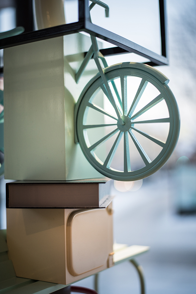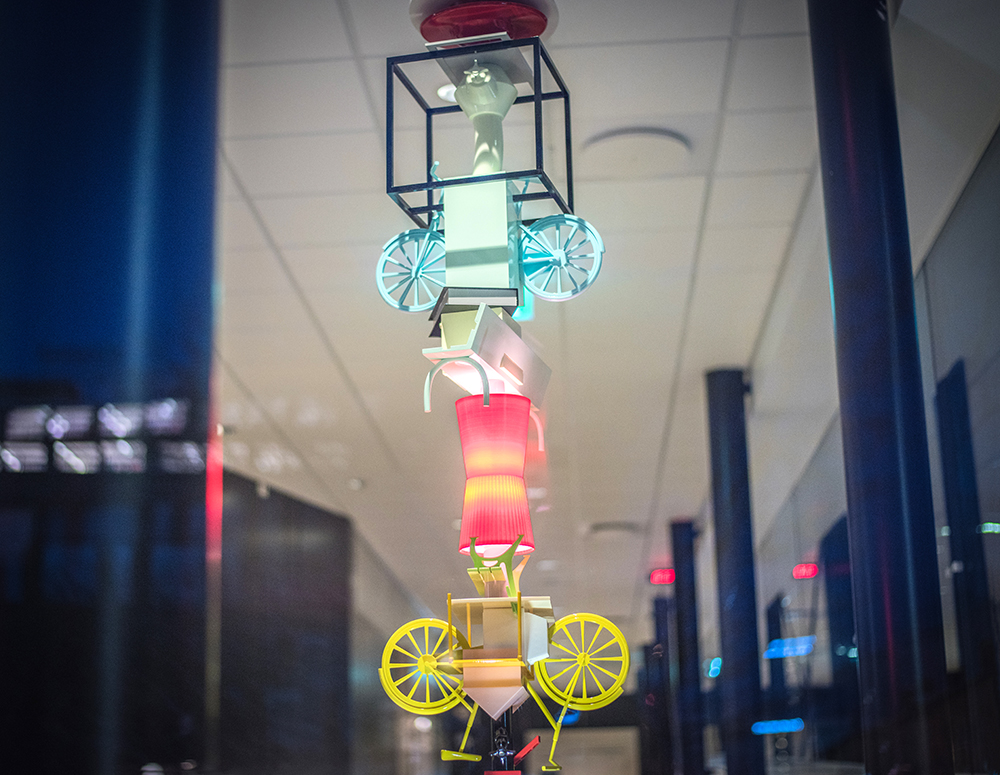 The sculpture constructed from odd things in strange sizes arouses curiosity; it entices the viewer to get close and allow their eyes explore the stack. The sculpture gently shakes up the everyday, mundane vision.It is not only the sculpture’s scale which has displacements, it is also something with the objects. Is that a bicycle over there; or is it Mickey Mouse’s ears? How can a goblet get bones from an ironing board? With gaudy colours, these unpredictable everyday objects build upon each other. The glossy varnished surface creates the impression that something is both captured and ephemeral in the same object.