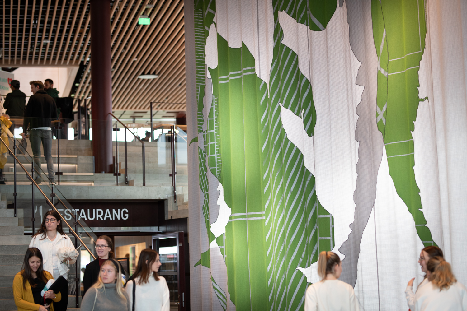 Mette Winckelmann’s textile sculpture Rörelse (Movement) functions as a room divider in the entrance of the new Studenthuset at Linköping University’s Campus Valla. In addition to creating serenity and privacy, the two-sided curtain also transforms the room into a stage.