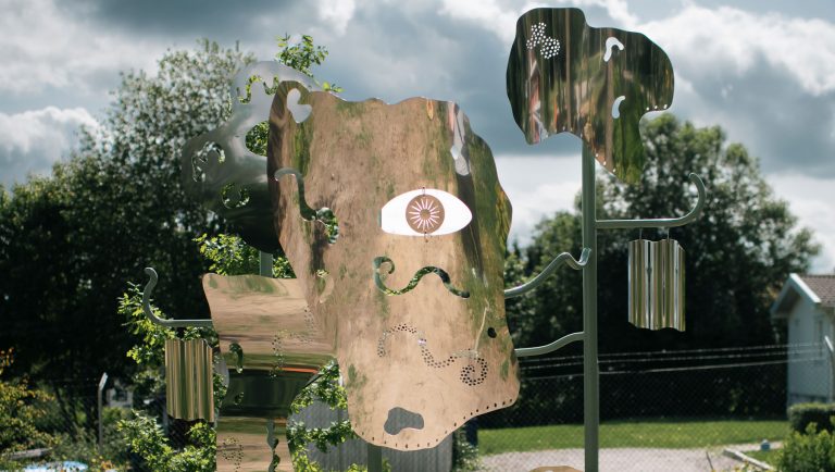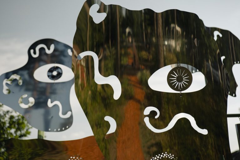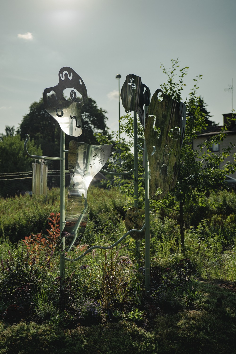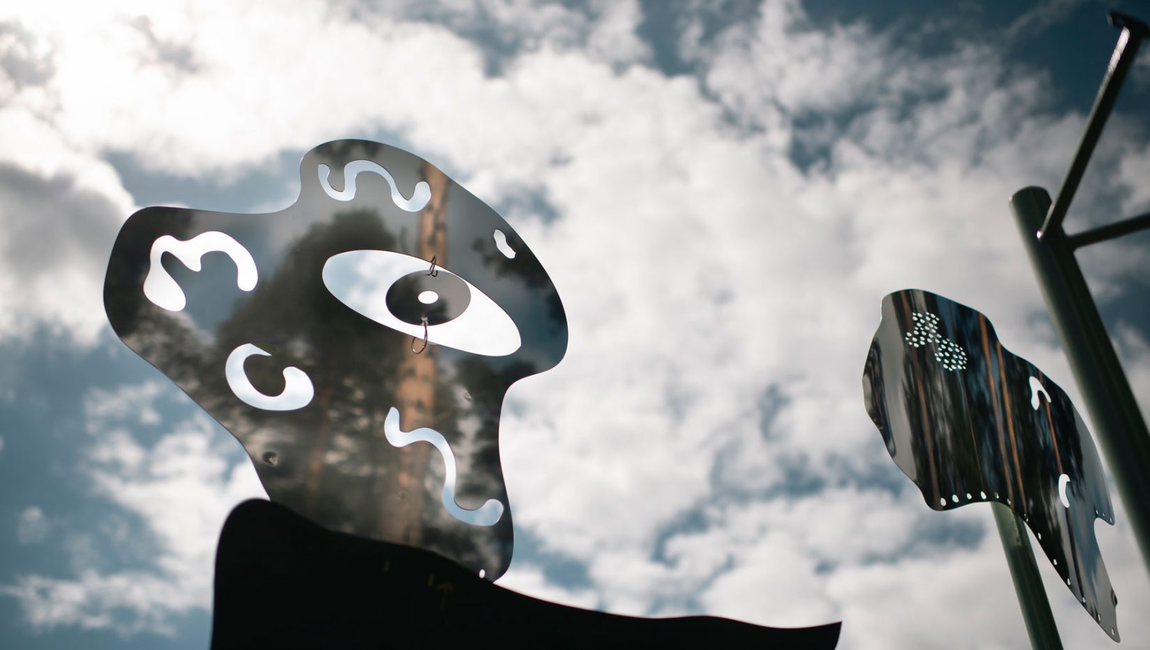 Åsa Cederqvist’s work The Borderland is an imaginary landscape and a playful staging within Heby Folkets Park. The scenography of the work flows into a clearing with tall pine trees that lies just beside the park’s entrance. Together with the landscape and vegetation, The Borderland creates spaces and stages that are there to be used, including a portal with a brick path and new plants. Further into the clearing there is a stage and a group of abstract stainless-steel figures that mirror and reflect the surroundings. Drawing on the history and materials of the area, especially clay and brick, the artistic additions build on the many stories of the site.