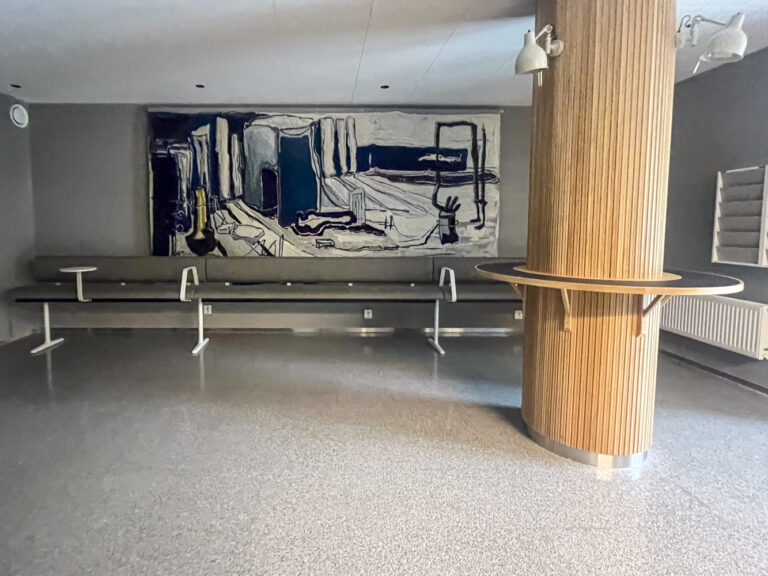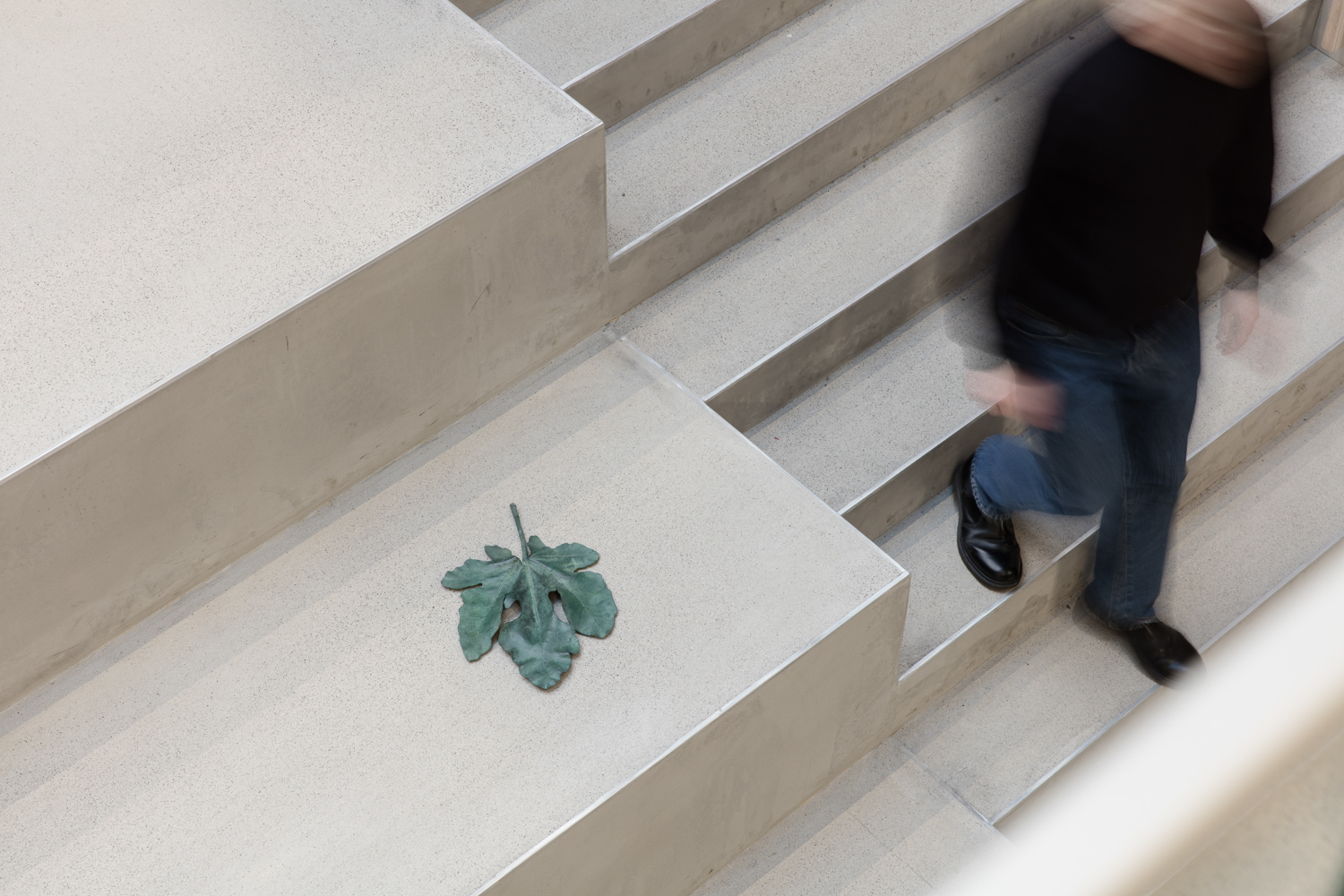 In the monumental stairwell that connects the five floors of the new Humanisten building, ten heavy, unique, life-size bronze leaves lie scattered as if they had floated down from the skylights. Together the leaves create a spatial rhythm in the monumental space. As a material, bronze is commonly associated with public sculptures, monuments, power and our desire for permanence. In the stairwell, however, Algün wishes to emphasise the covering function of the motif, the leaves. In western art history, fig leaves have often been used to conceal – and as a result draw attention to – that which is not intended to be seen. For example, for a period of time the naturalistically reproduced genitals on the replica of Michelangelo’s famous statue of David in the Victoria and Albert Museum were censored by a large fig leaf. In Algün’s intervention, the concealing aspect of the leaves is disturbed by its meticulous, sensual design that, in addition to being pleasing to the eye, also invites tactile intimacy.