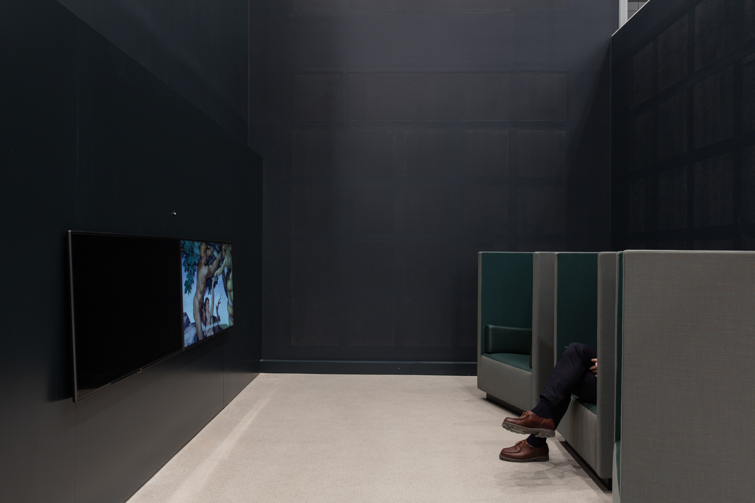 At Humanisten, bodies in motion echo Algün’s movements during her Istanbul survey. Through connections below and behind the stairwell the visitor can access the spatial corner where the two-channel video is installed. The video enhances the narrative on how knowledge and cognizance are passed down over time; orally, in writing and through images. This is how a multifaceted world emerges in a field of tension between elusive but controlling power structures and the driving forces of individuals to visualise and transform superiority and subordination. Facing the two screens in the video corner, comfortable armchairs provide visitors with the opportunity to reflect in private on issues of resistance and integrity raised by the artwork.