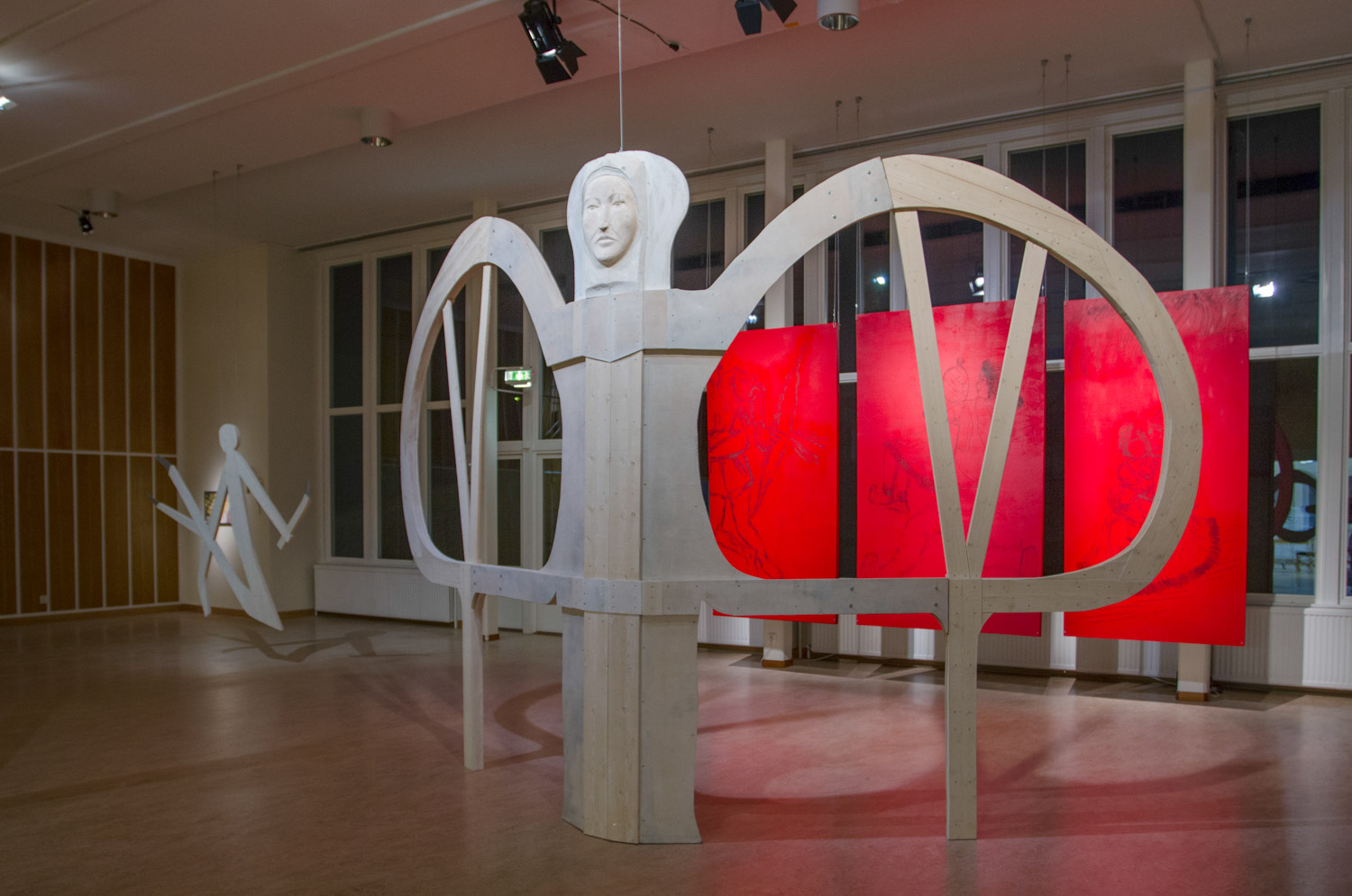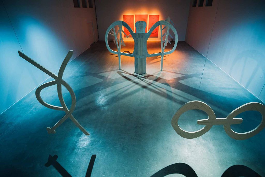 Aage Gaup has been working as an artist and set designer since the early 1970s. He was a member of the legendary Masi group which was the forerunner of the Sami Artists’ Association formed in 1979, which later established Sámi Dáiddaguovddáš in 1986. On display at Välkommaskolan is an installation of large wooden sculptures he made for the exhibition Old Language – New Forms and Refugees, 2018, at Sámi Dáiddaguovddáš (Sami Centre for Contemporary Art) in Karasjok, Norway. Here Gaup manifests his interest in the visual language found, for example, among the symbols on the ornate drums of the Sami shamans known as Nåjder. If the symbols are already three-dimensional, their language constitutes a kind of fourth dimension. Gaup’s knowledge of scenography is apparent in the light and sound design that accompanies the sculptures developed in collaboration with Halvdan Nedrejord (sound) and Kurt Hermansen (light).