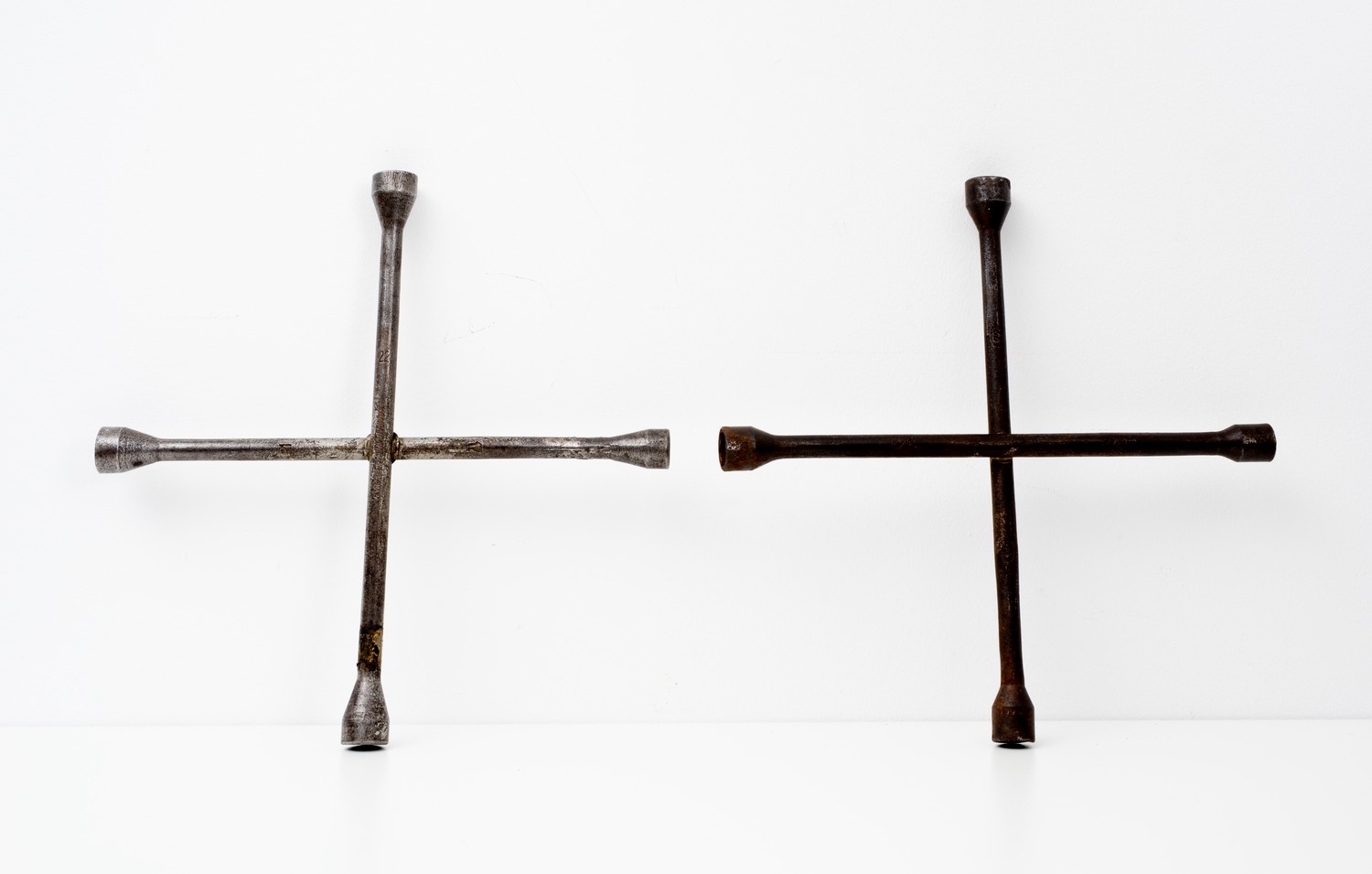 Death by Nature is a wall installation composed of lug wrenches, a Volvo grille and nails. It was acquired for the Corona Collection, an initiative to support the Swedish art scene during the COVID-19 pandemic.